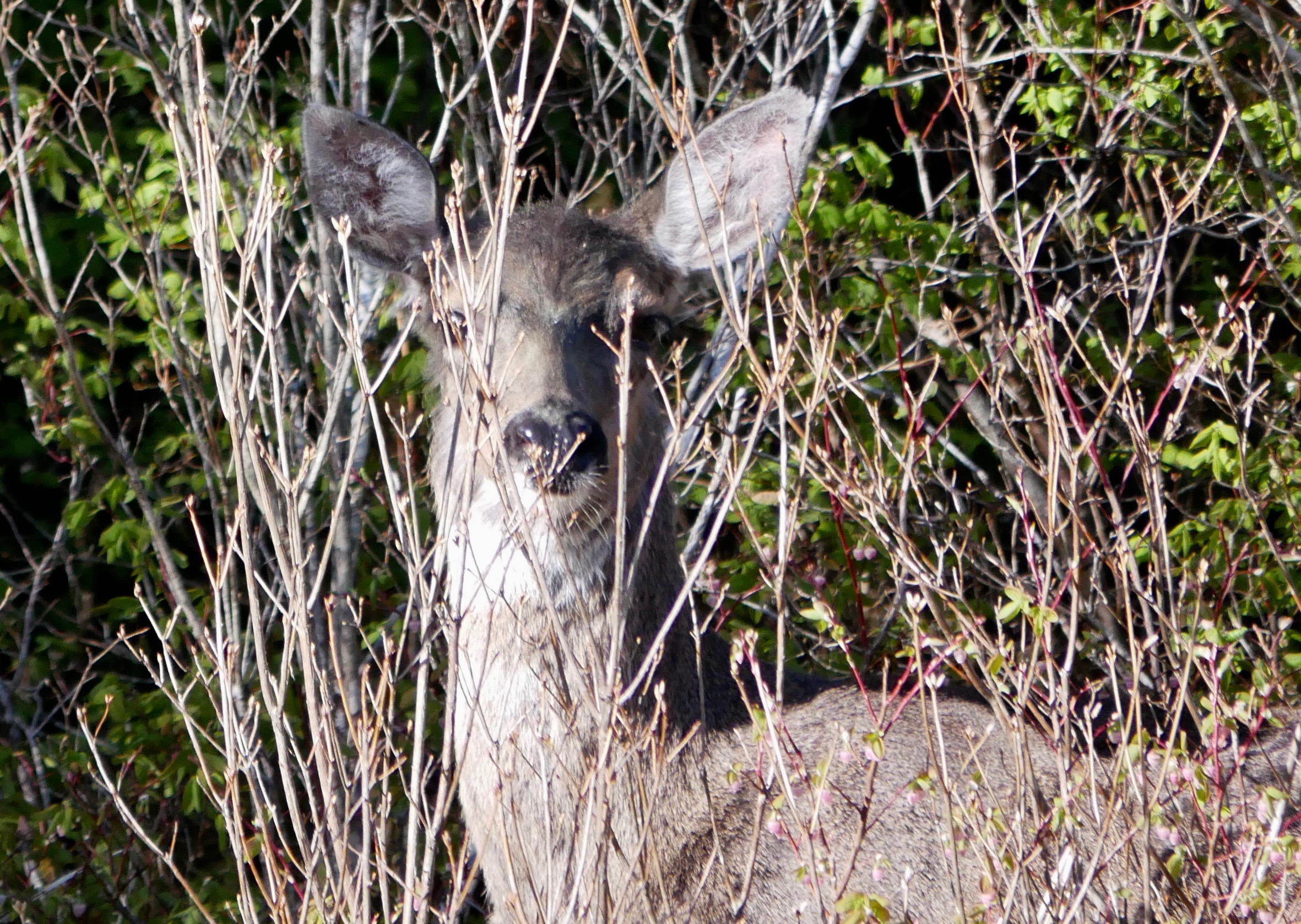 On the drive to the trailhead, I thought about deer and when a doe walked in front of the car. After we stopped, it crossed to the west side of the road and tried to find cover behind a sparse blueberry bush. Another deer appeared to be waiting for us at the trailhead parking area. Acting like it was still undiscovered, it tiptoed off the trail and into a forest tangle.