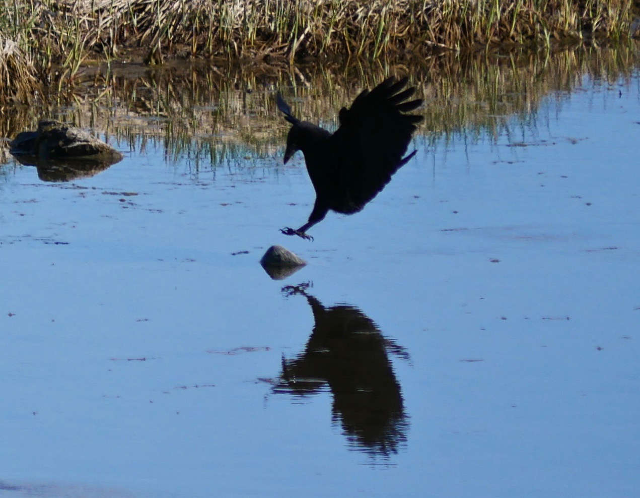 Things have calmed down on the delta since our last visit. The resident eagles have reached accommodation with the crows, which no longer try to drive the bigger predators from their roosts. Freed up from defense work, the crows have spread out to feed on the tidal meadow. One crow lands on a rock in the middle of tiny pond, apparently to enjoy its reflection in the pond’s surface. It doesn’t seem to notice a sandpiper that wades past.