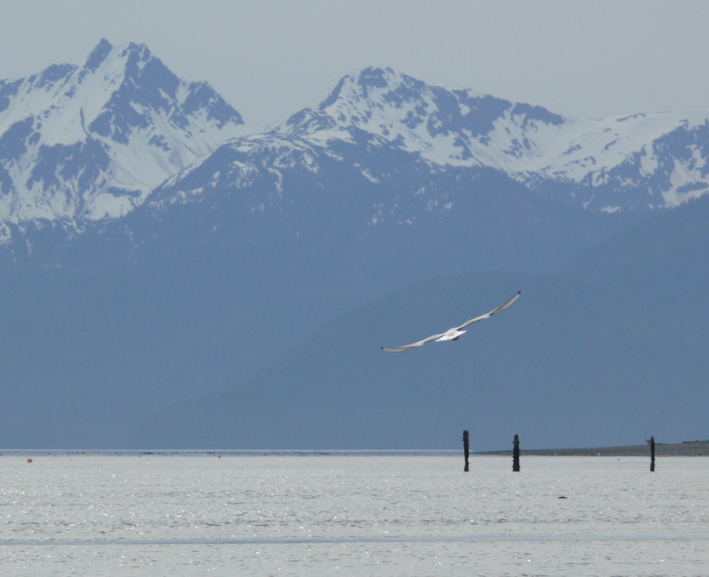 No bald eagles are roosting on the roof of the mine’s ventilator shaft. That’s the first thing I notice when Aki and I drop onto Sandy Beach from the Treadwell Woods. The beach has that sinister feel that always comes when a thin veil of overcast replaces a prior day’s blue sky. This is reinforced by the absence of any birds on the beach. The woods were full of birdsong belted out by winter wrens, yellow warblers, dark-eyed juncos, and robins. On the beach not even a raven is around to croak us a warning.