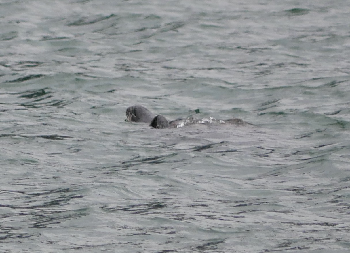 In the water near the salmon holding pens a half-a-dozen harbor seals raise their heads so that their eyes clear the surface. Another seal floats on its back, apparently asleep. Those awake watch a hatchery worker toss handfuls of fish food into the salmon smolt holding pens. Do they expect the next handful to be tossed in their direction?