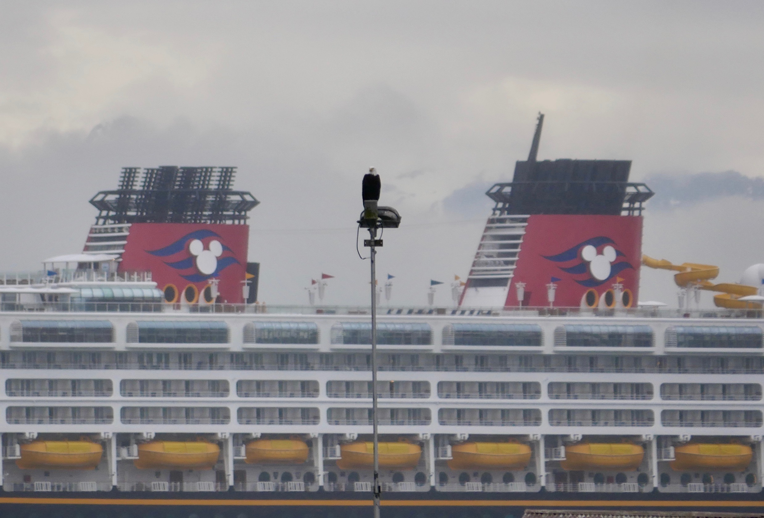 The whale statue plaza is deserted. On a mid-channel navigational marker, an eagle sits, its head turned toward a gang of gulls clouded over a school of salmon smolt. The big bird launches from the marker and glides toward the gulls with talons extended. In seconds the gulls drive away the eagle. One escorts the still hungry eagle back to its mid-channel perch.