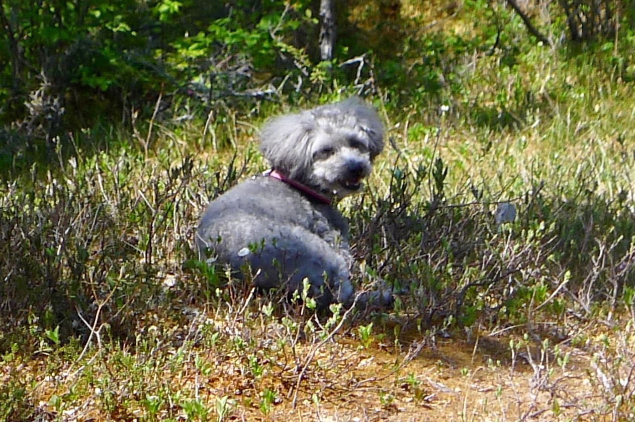 I turn to mutter something to her about the abundant of bog rosemary flowers on the meadow and find that the little dog has moved to a shady verge. She looks content, like she could stay there until nightfall.