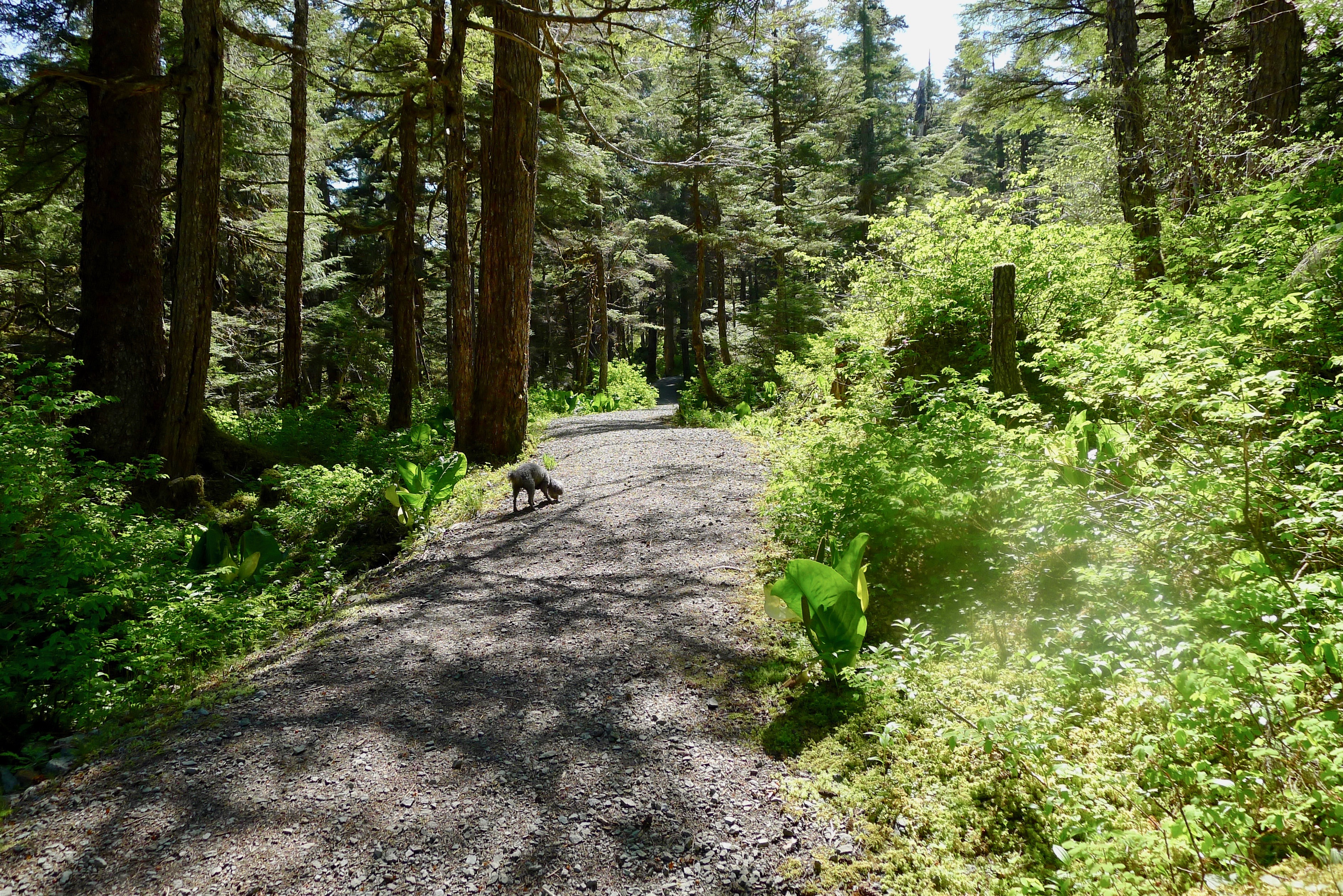 The way Aki is panting, you’d think we were crossing the Gobi Desert in high summer. The little dog and I are on a mountain meadow warmed by the sun to 67 degrees (f.)—what we call Tee Shirt weather. Aki can’t strip off her coat of fur so is overheating.
