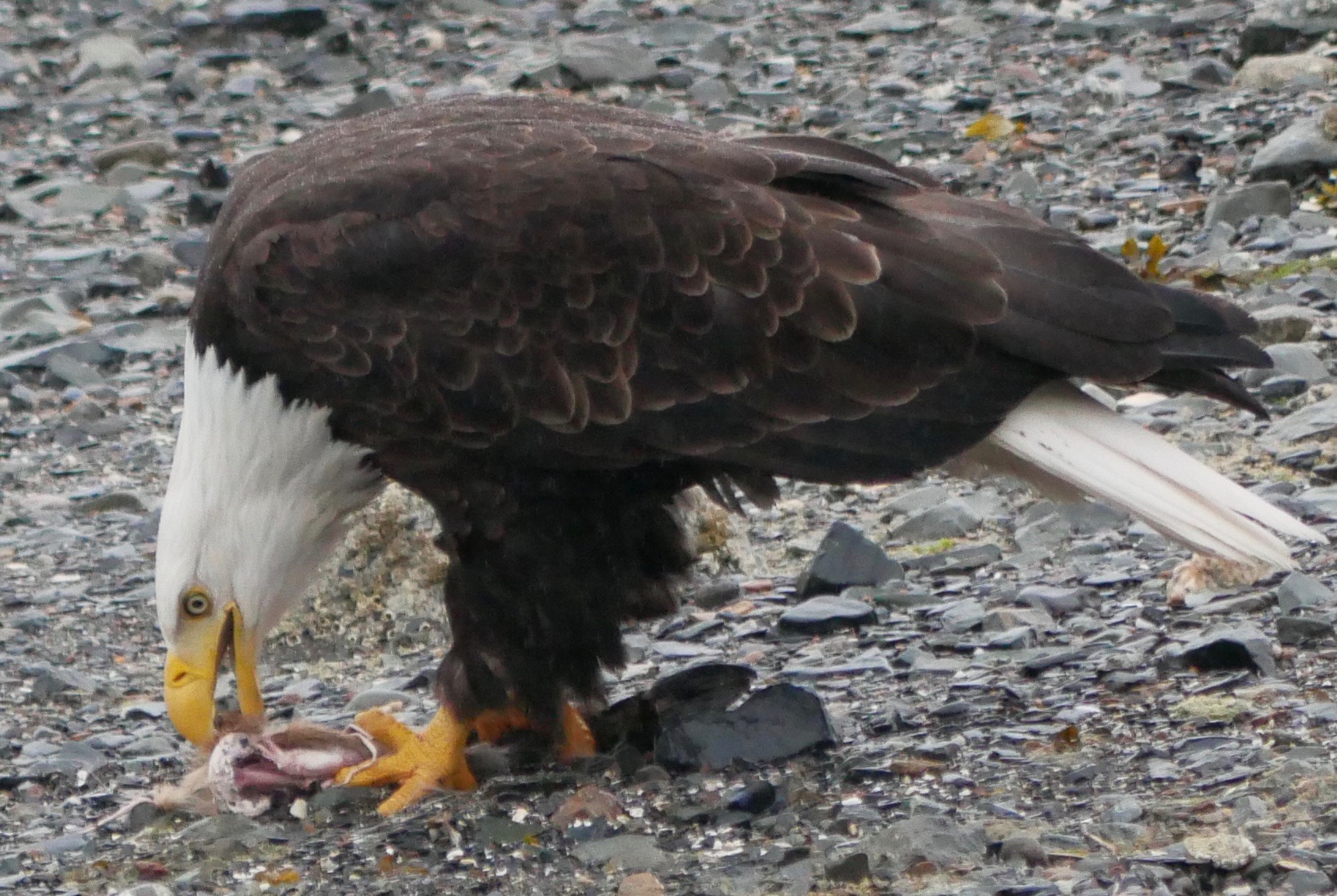 Thinking about the disappointed eagle, I follow Aki onto the Outer Point Beach. A solitary eagle flies from Shaman Island to a beachside spruce. Otherwise, only gulls and gulls animate the grey scene. A puff of vapor forms above the surface of Stephen’s Passage. In seconds I can make out the black back of an exhaling humpback whale. Just behind the surfacing whale, another vapor plume appears.