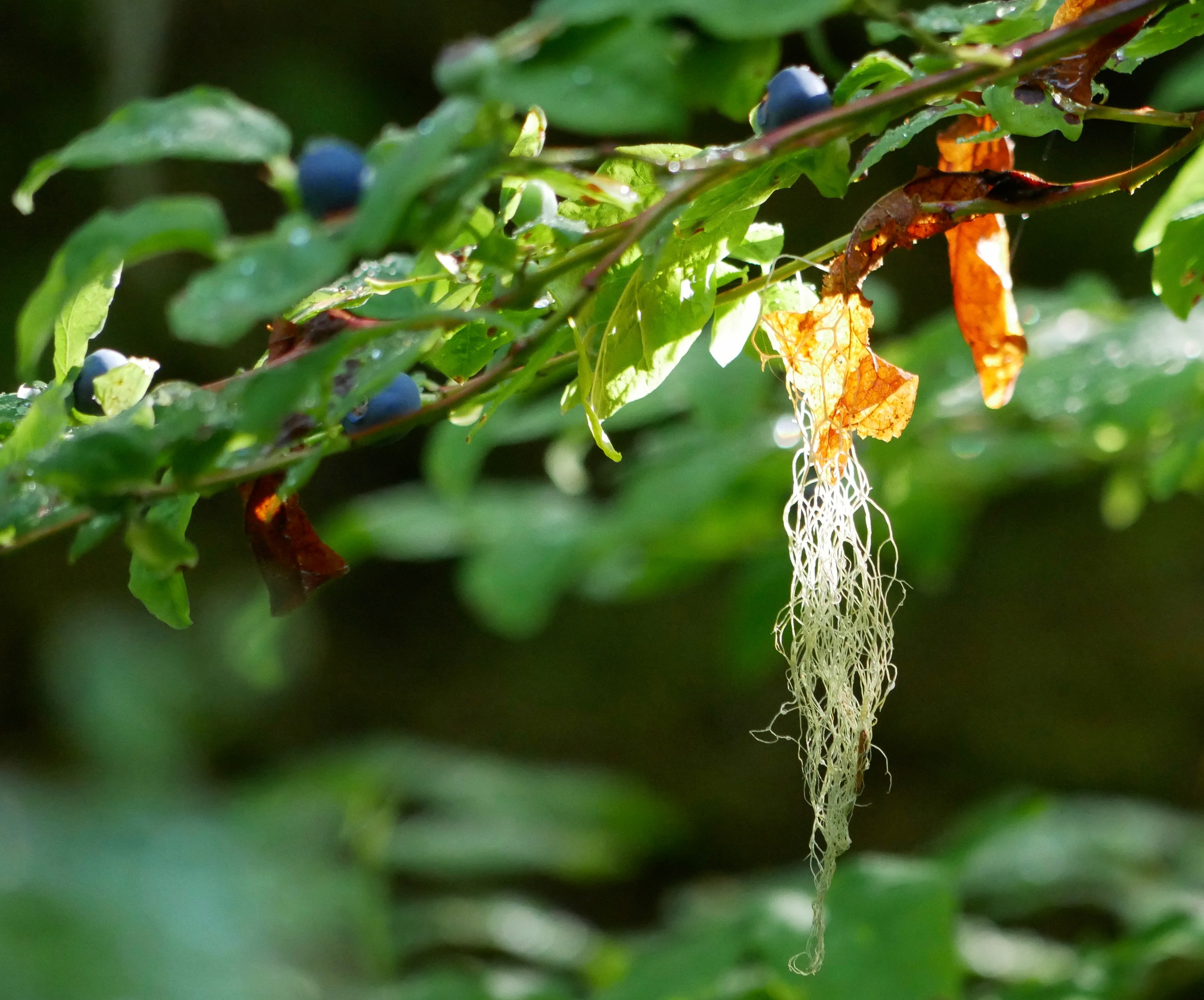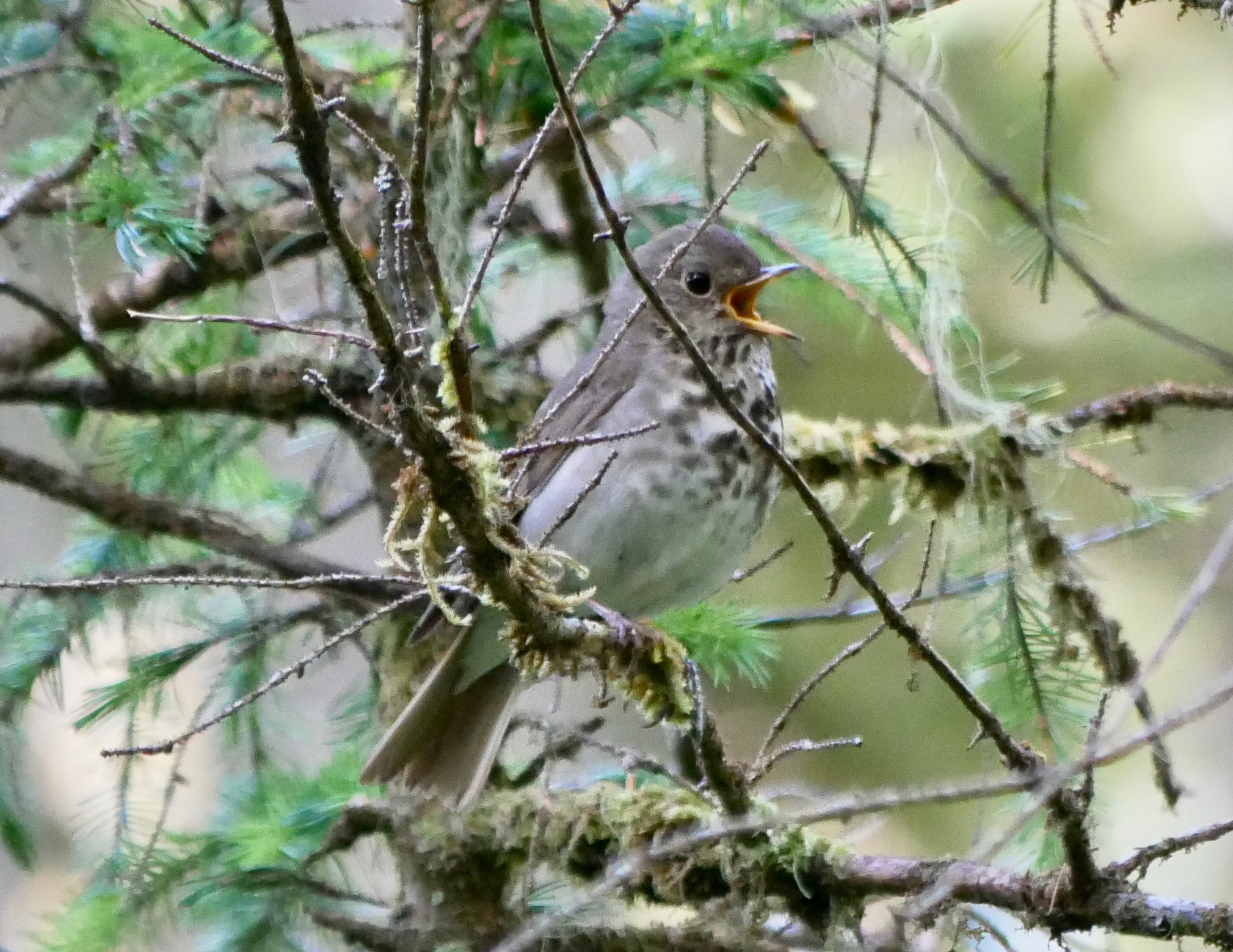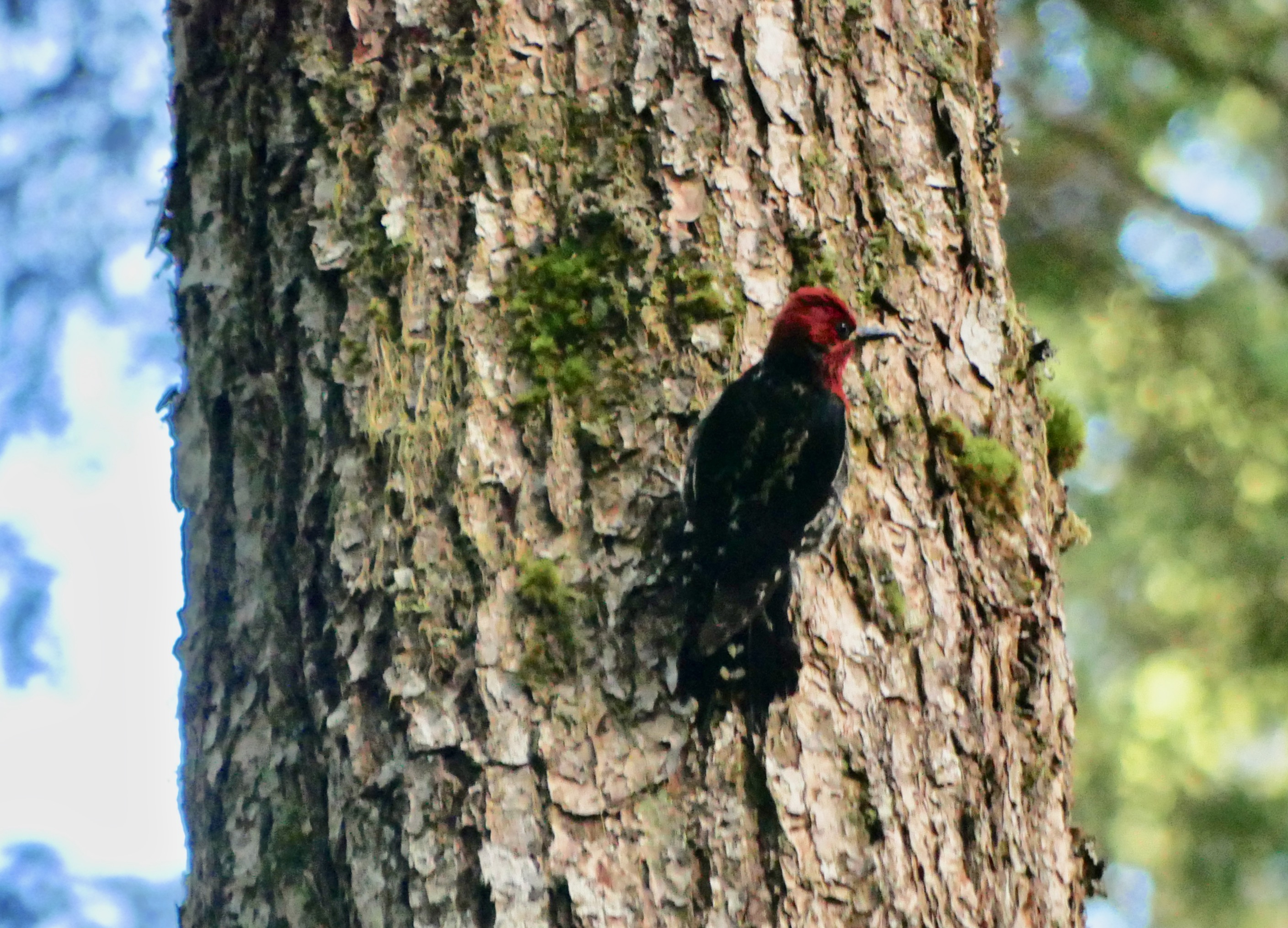 The leaves of understory plants in the forest are still weighed down with rain from a recent shower. They sparkle when struck by sun shafts. Above the trail a gray thrush mom tries to induce one of its chicks to fledge. In a nearby hemlock, a red-breasted sapsucker stops hammering the tree’s bark to give the little dog the stink eye.