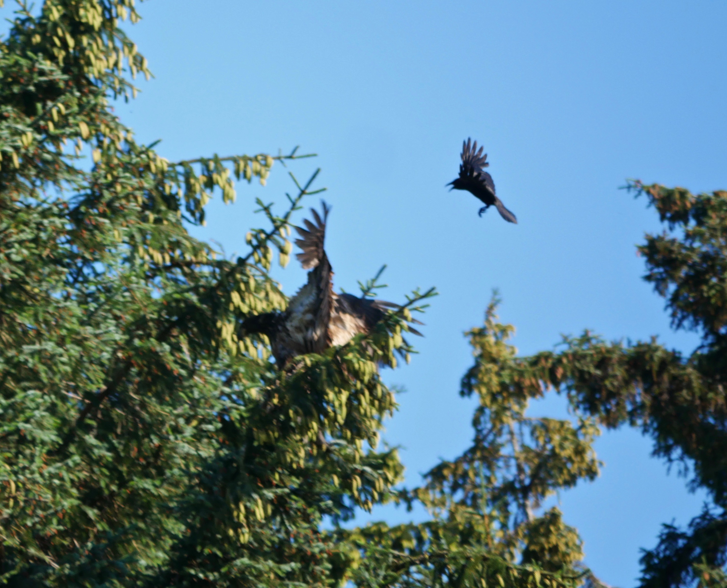 A spit covered with wild roses and blooming fireweed connects the Douglas Island with a forested island at the mouth of Fish Creek. I counted six eagles roosting in trees on the near edge of the island forest. Another eagle bounced up and down in the top of another spruce, having been chased there by a fierce crow. The diminutive warriors own the interior of the island where they are raising this year’s young. They begrudgingly allow the eagles to roost on the forest edge.
