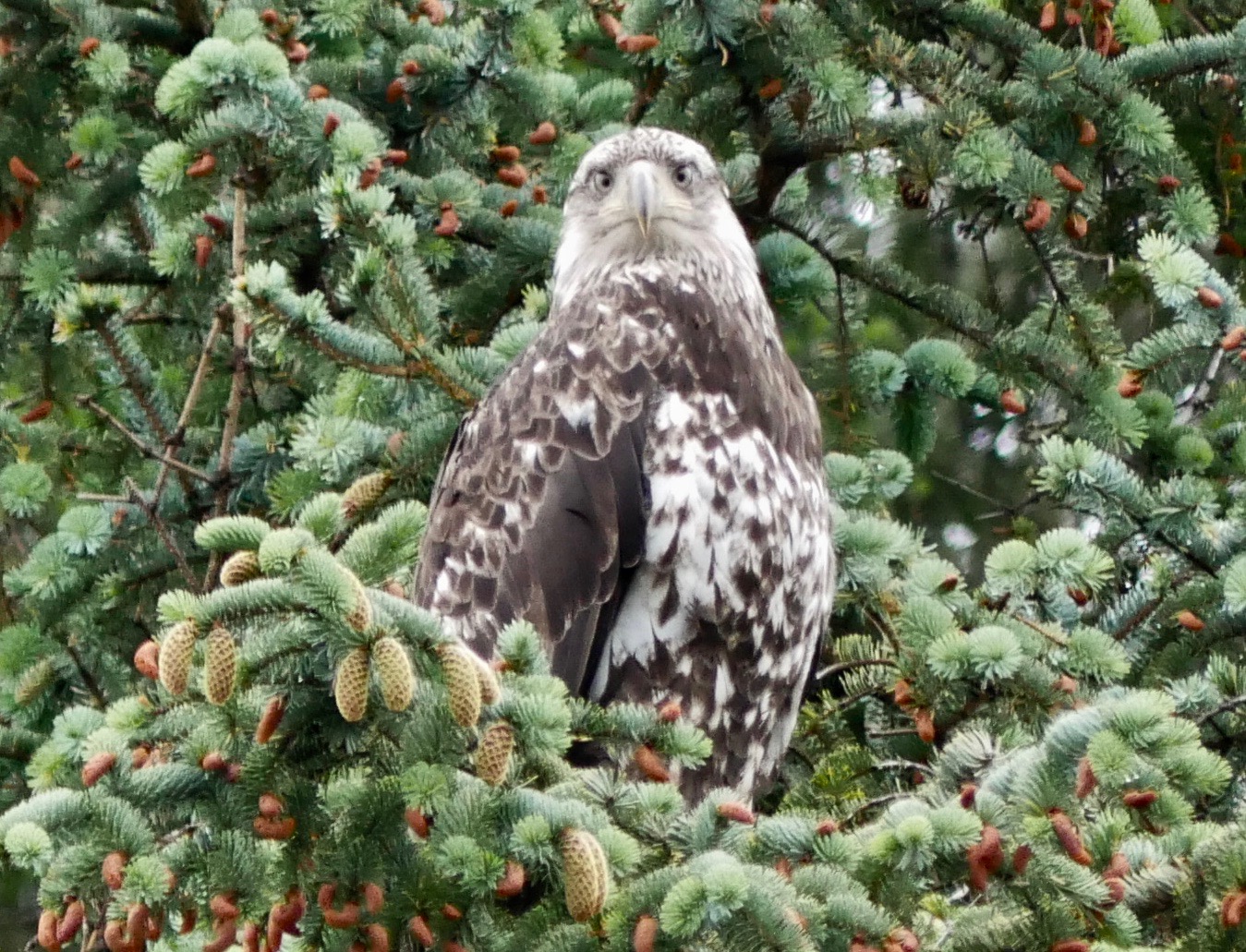 In order to return to the forest trail we have to walk under a spruce tree occupied by two very young bald eagles. A mature eagle roosts above them like a watchful parent. The young ones, recent from their nest, look at us with their pale-green eyes. They are so large and fierce looking, I can’t convince myself that they hatched a few months ago. Like the flowers, the eagles can’t afford to waste a day of summer.