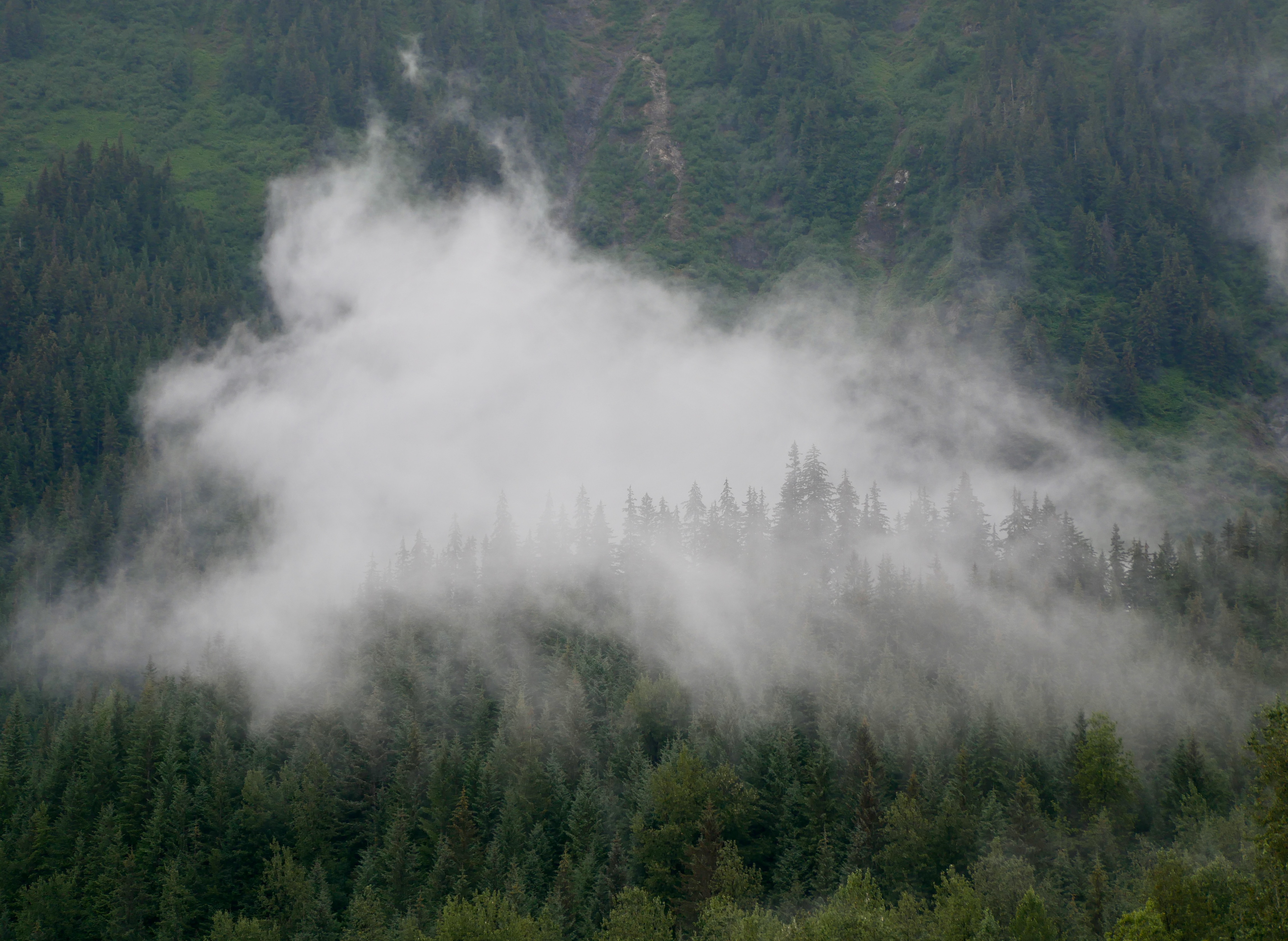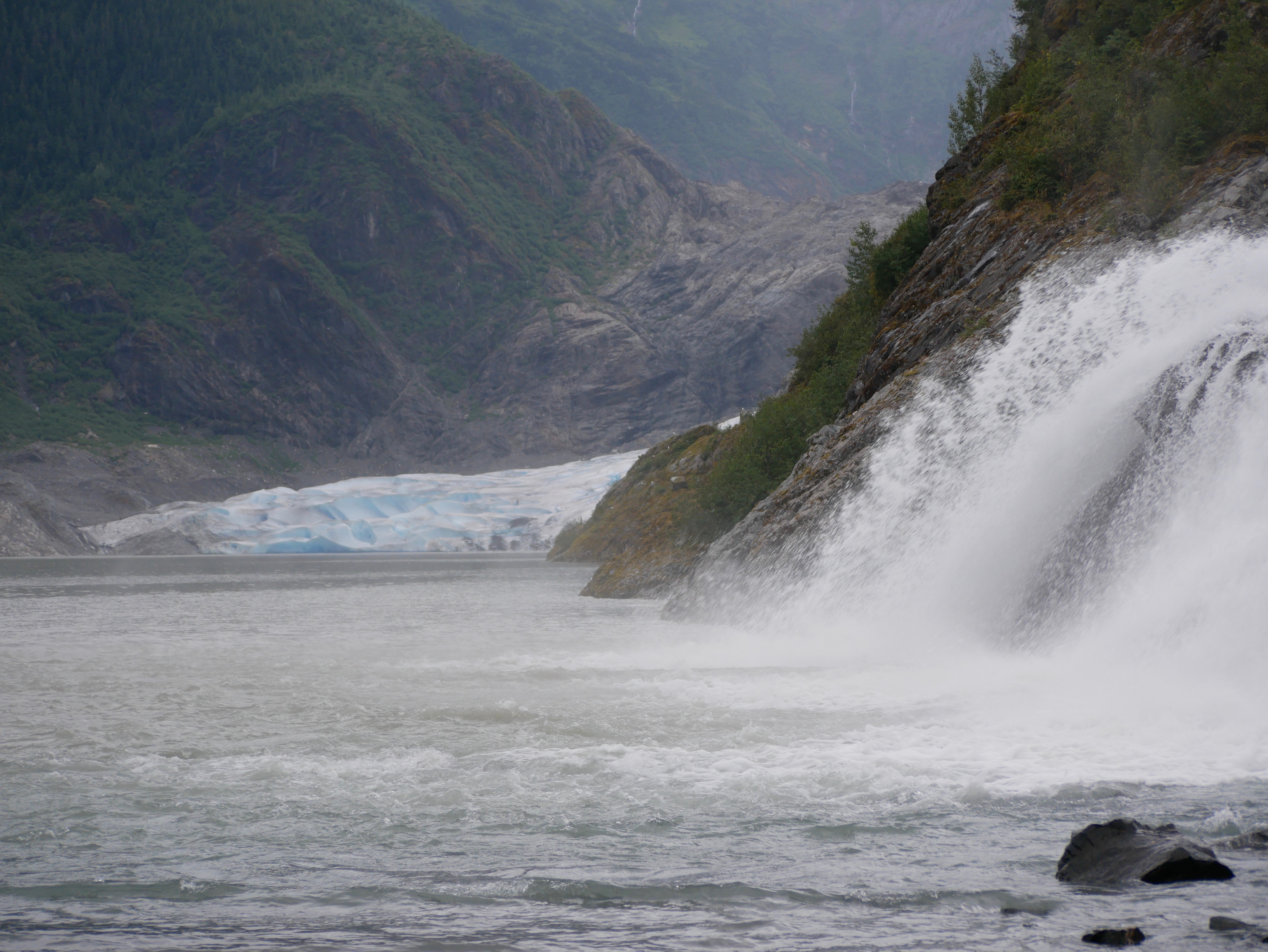 Aki and I passed just one cruise ship on our way to the glacier. It was just tying up at the old steamship dock. In a few hours five more of the floating hotels will be docked and disgorging over 20,000 passengers onto Juneau’s downtown streets. Many of those visitors will take buses out to the Mendenhall Glacier. Some will clog the trail to Nugget Falls. We should be early enough to have the trail to ourselves this morning.