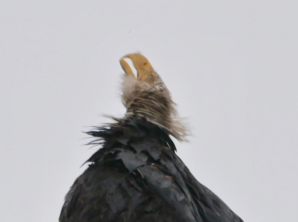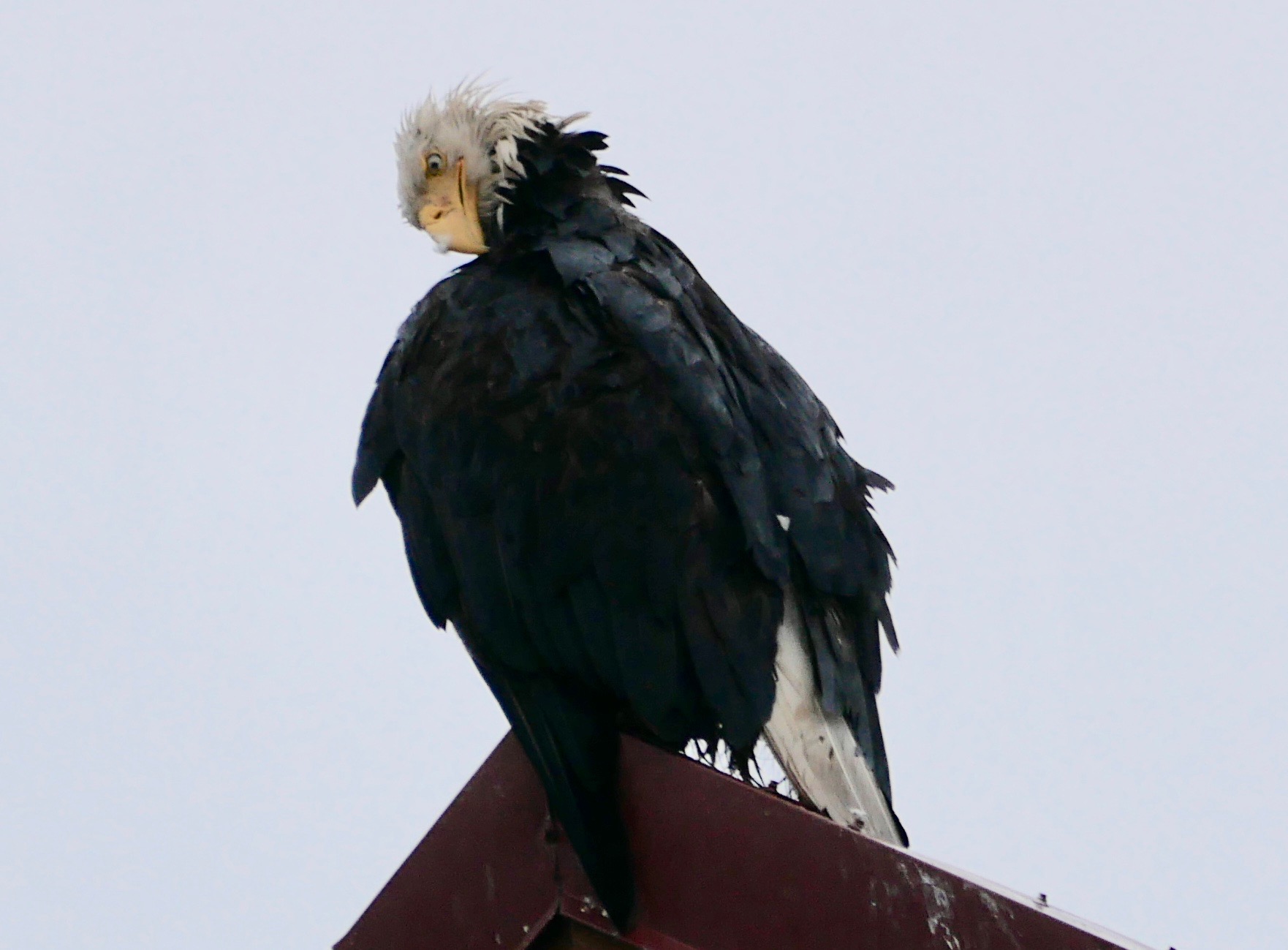 A waterlogged eagle grooms itself while perched on top of the old ventilation tower. With its fierce gaze and feathers all ahoo, it looks like an awakening dragon. But a puff of down sticking to its beak shatters its tough guy image.