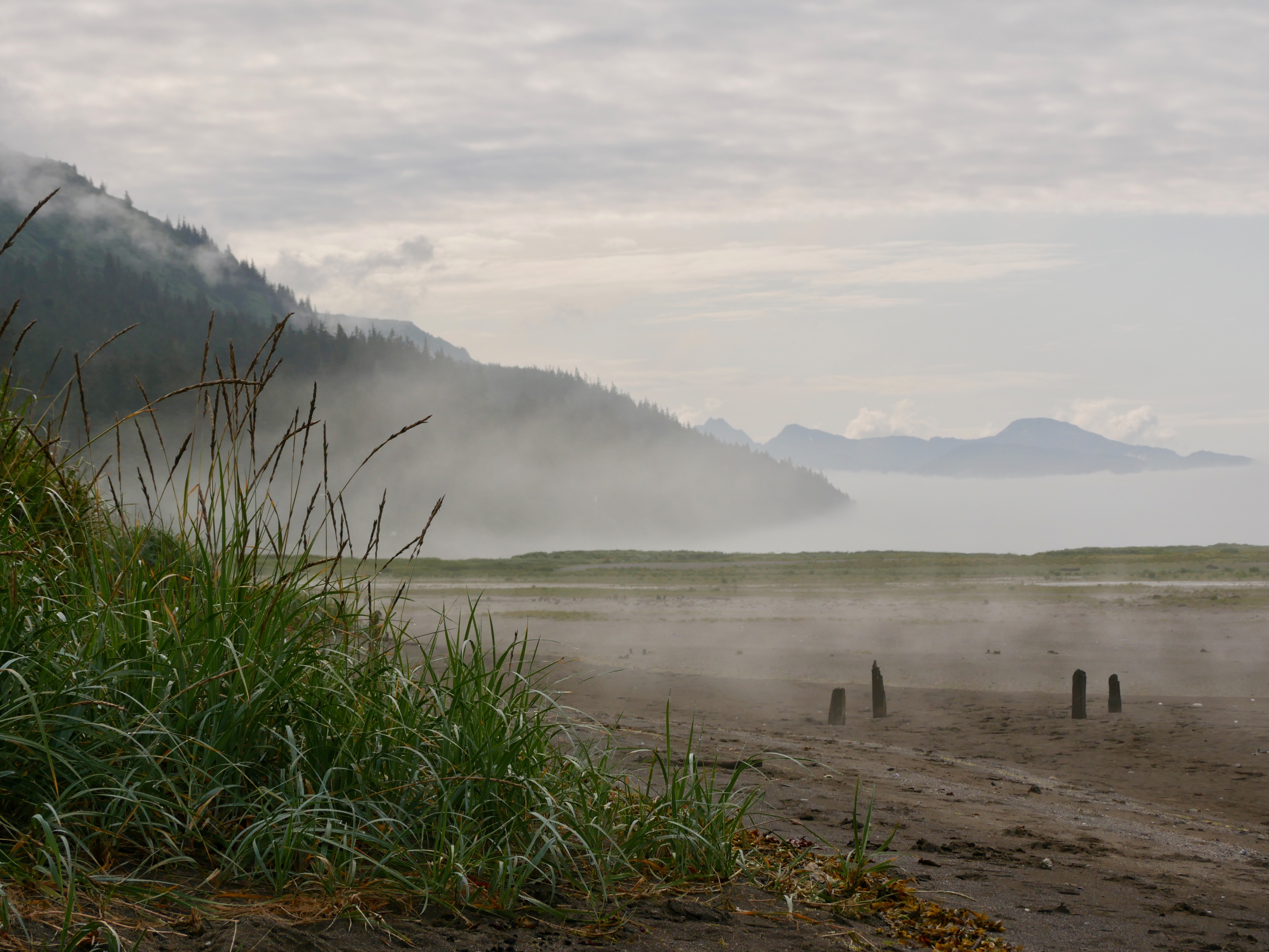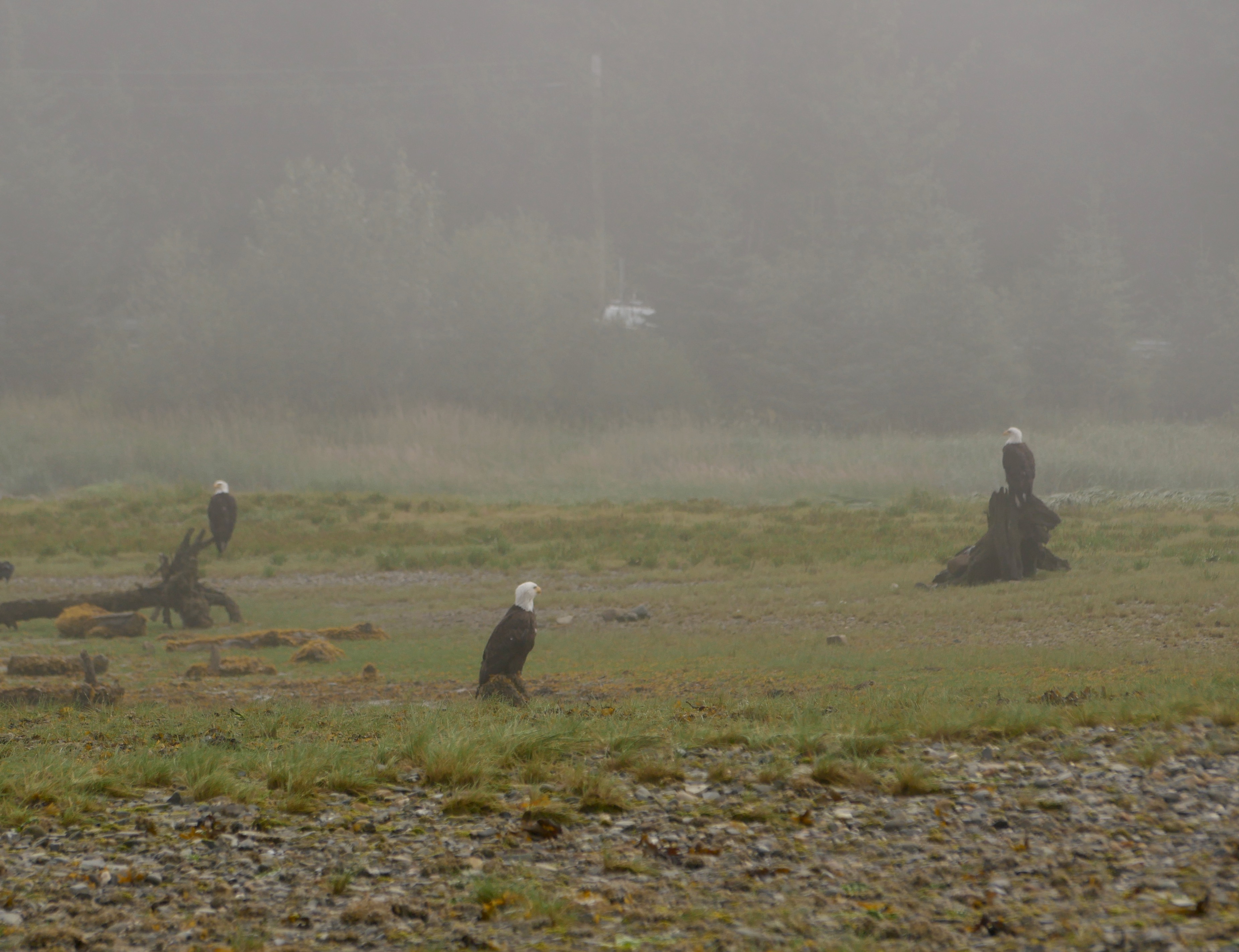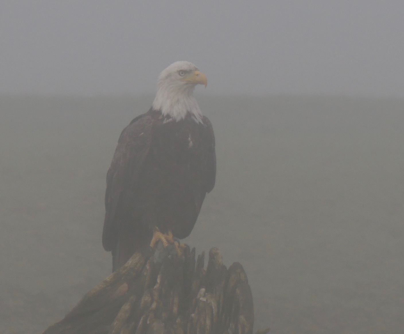 I put Aki on a lead this foggy morning after spotting a bald eagle, as indistinct as a ghost in the gloom, flying a circle around us. Creek and tidal currents have formed a gravel causeway above the delta’s marshy wetlands. I am about walk onto the causeway when I spot an eagle in the middle of it perched on a driftwood root wad. Five or six other eagles stand on the beach or other driftwood logs but they all have to look up to see the eagle on the causeway.