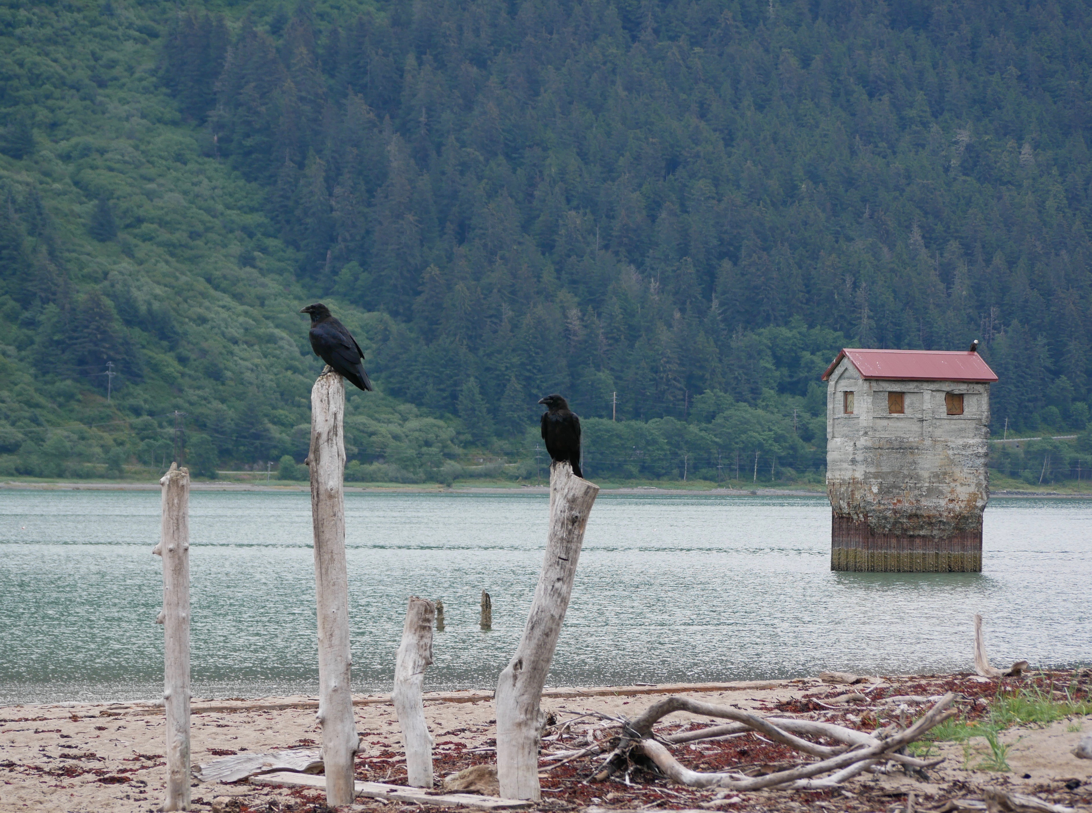 Something has drawn a cabal of ravens to Sandy Beach. A dozen of the grouchy birds sulk on the sand or on top of broken wharf pilings. The usual eagle sits on its perch on the roof of the old ventilation shaft. The eagle isn’t watching the ravens. It stares down the beach toward Marmion Island.