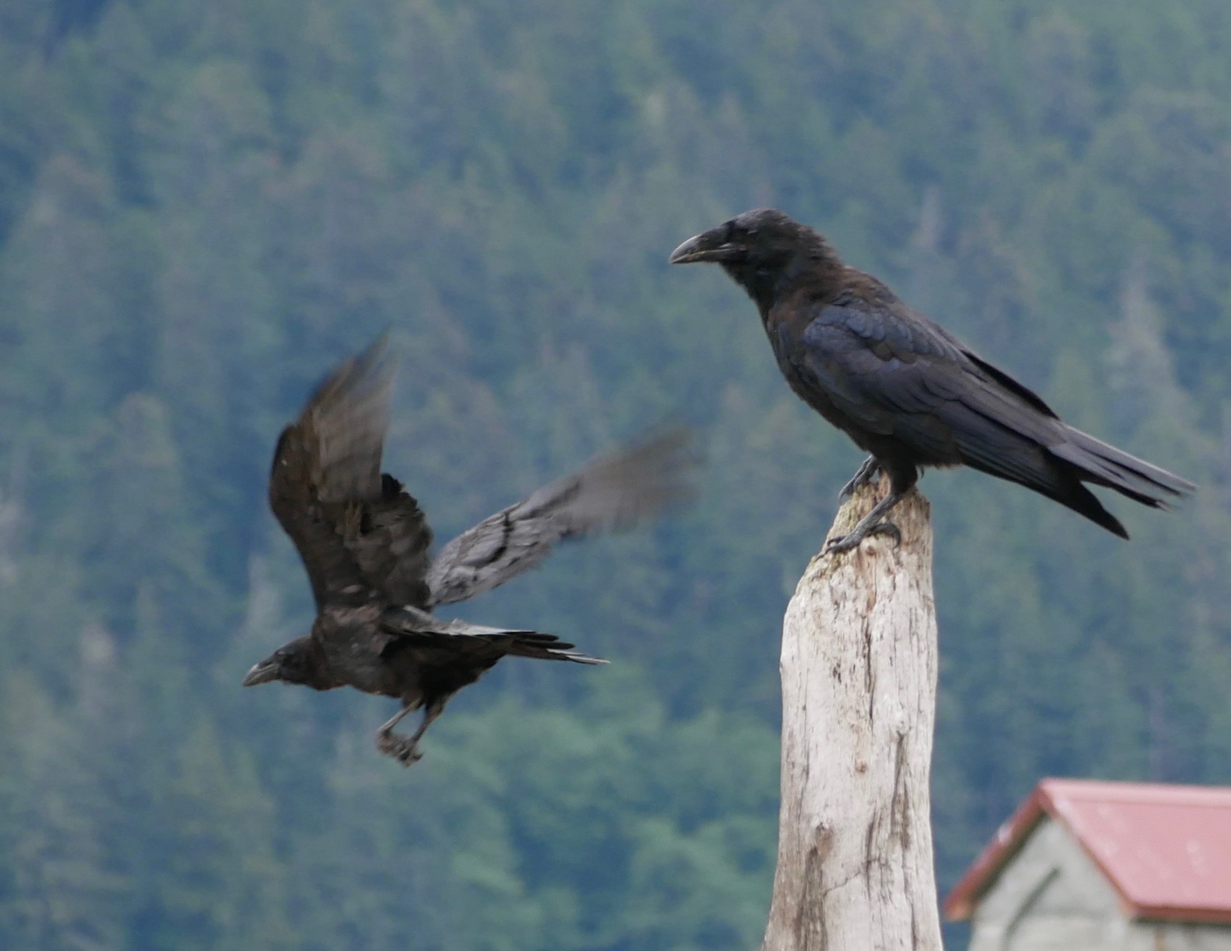 I follow the eagle’s gaze and spot what looks like a giant bald eagle walking along the edge of the collapsed glory hole. In the rainforest, ravens are credited in legend with having magical powers, not eagles. Are the little dog and I witnessing the start of a new legend.