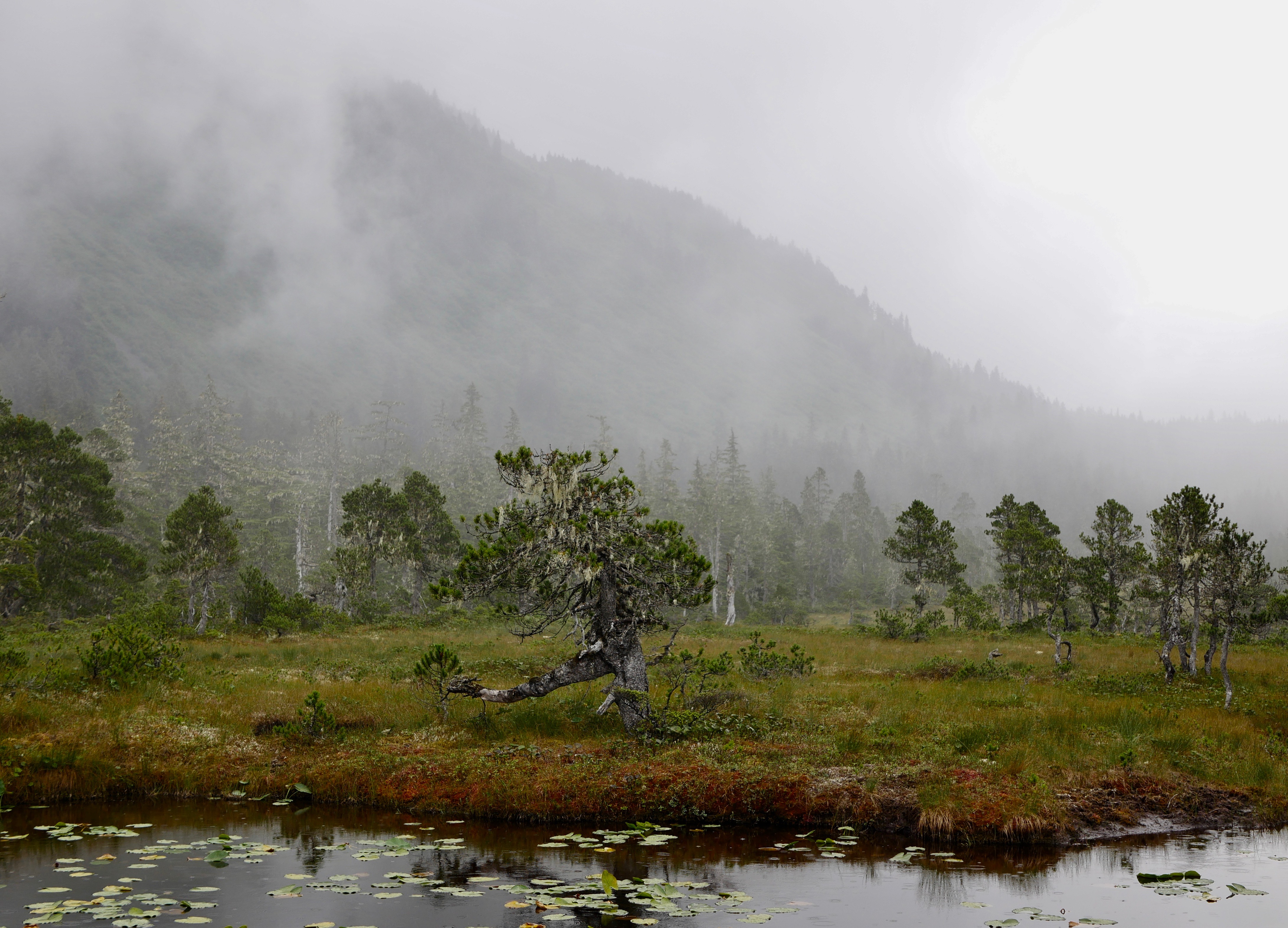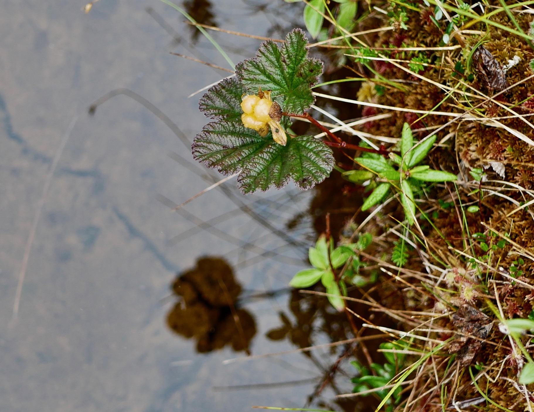 This morning Aki sticks to the trail across this mountain meadow as I wander its margins looking for cloudberries. She doesn’t follow me until the distance between us exceeds her comfort level. Nearing that point, I turn around and see her, four paws planted firmly on the proper trail, giving me a look of incongruity. She doesn’t flinch even though heavy rain is soaking into her fur. Seconds later she trots up to me just as a gang of six large dogs run head on into a family with their own dog.