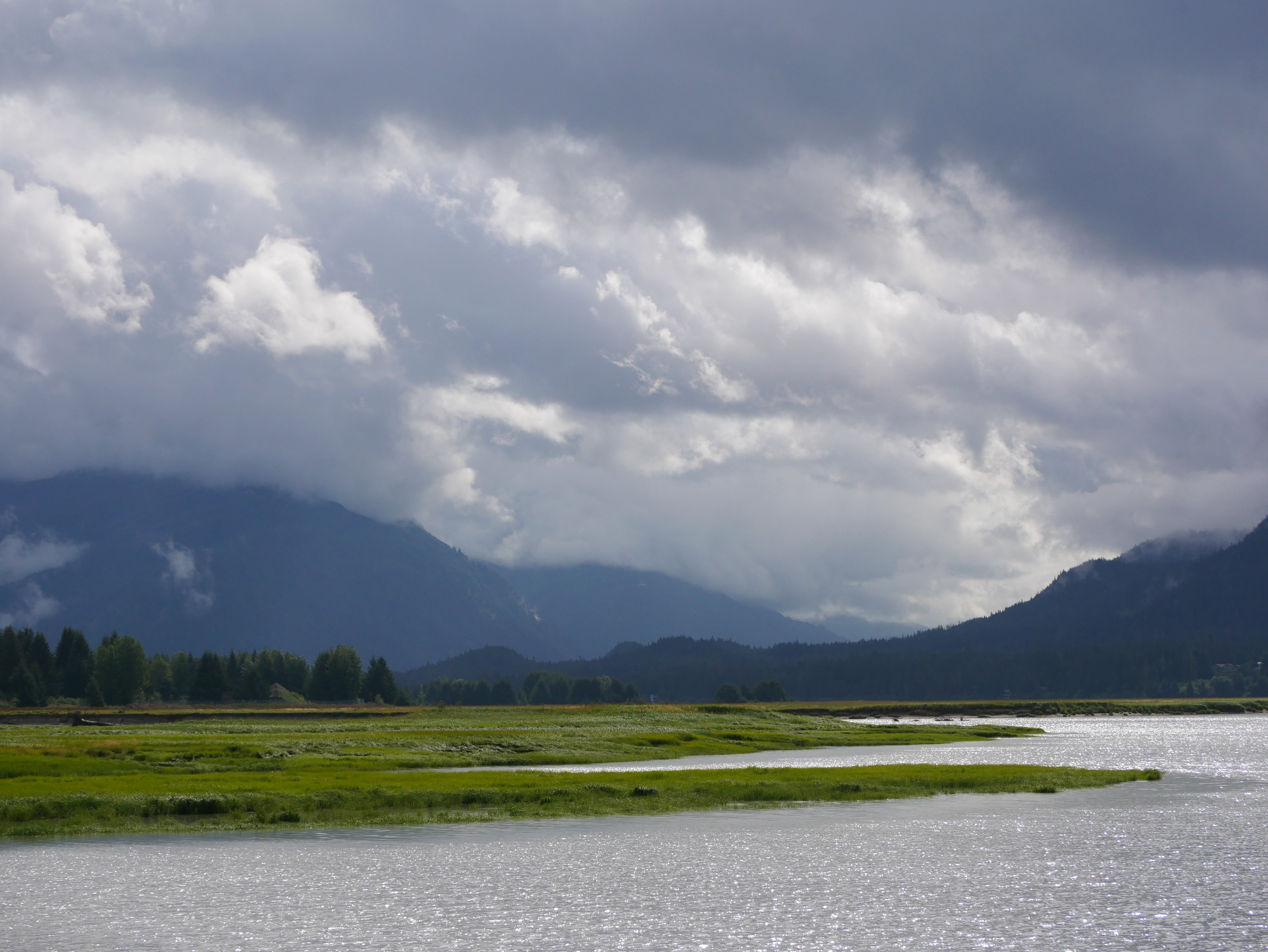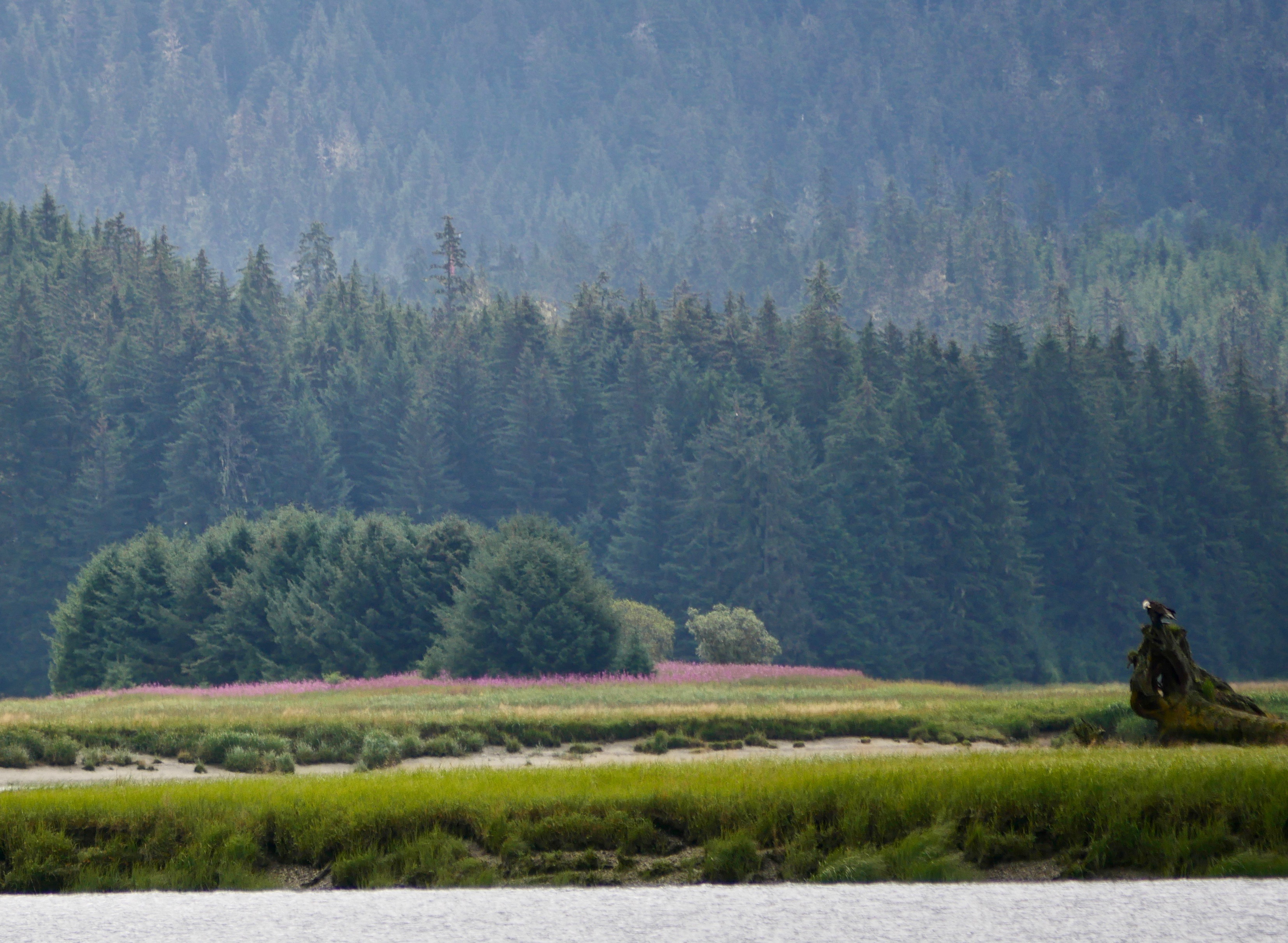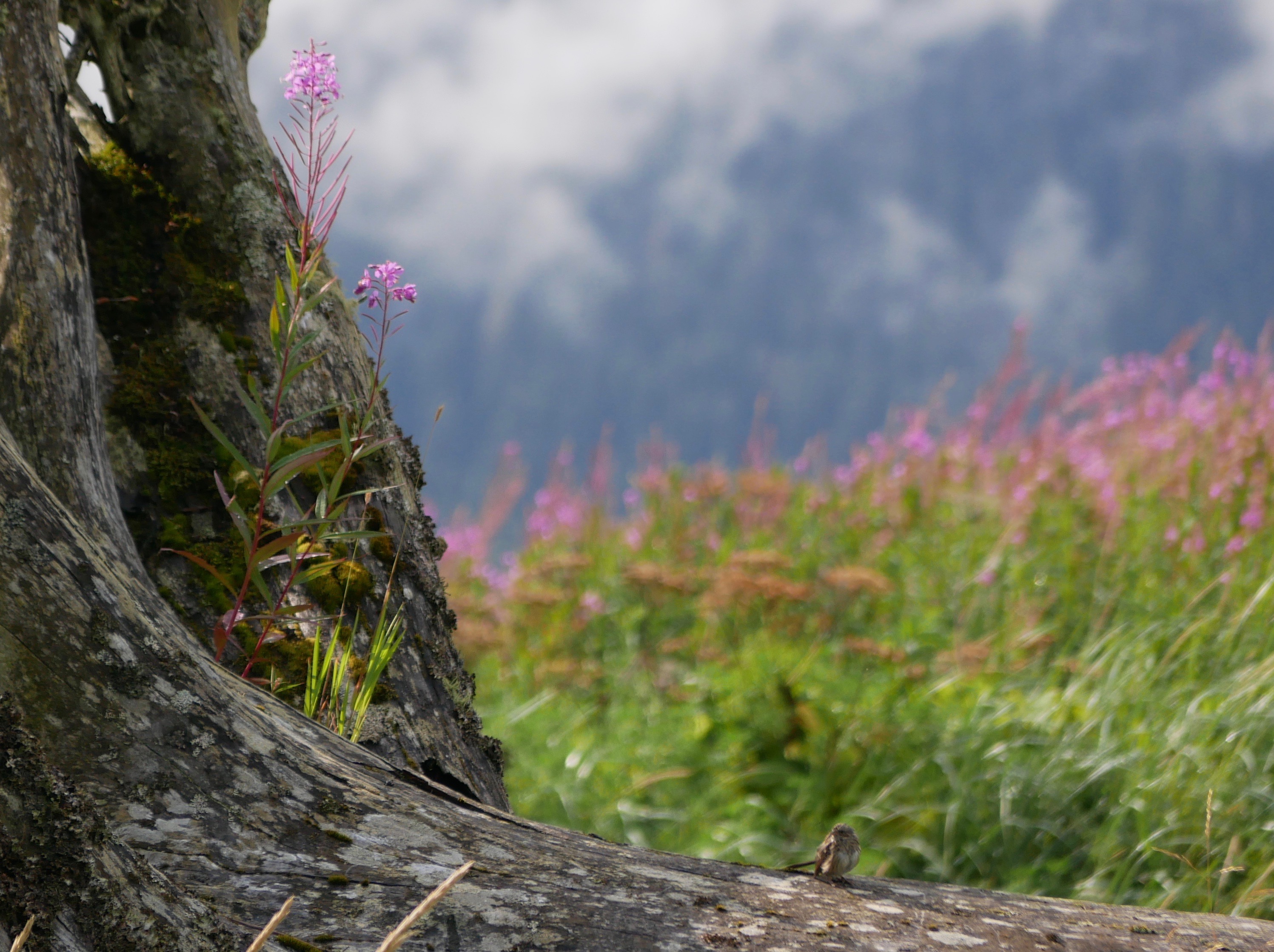 A gray quilt of clouds hangs over the wetlands when Aki and I emerge from a tunnel of willows. Fireweeds grow here as well, forming thick magenta patches on a grassy plain. Drab-colored sparrows watch us while perched in dried cow parsnip stalks. Shafts of sunlight break through the cloud canopy to brighten the yellowing grass and the surface of the Mendenhall River. It just reaches a bald eagle keeping lookout on a driftwood log.