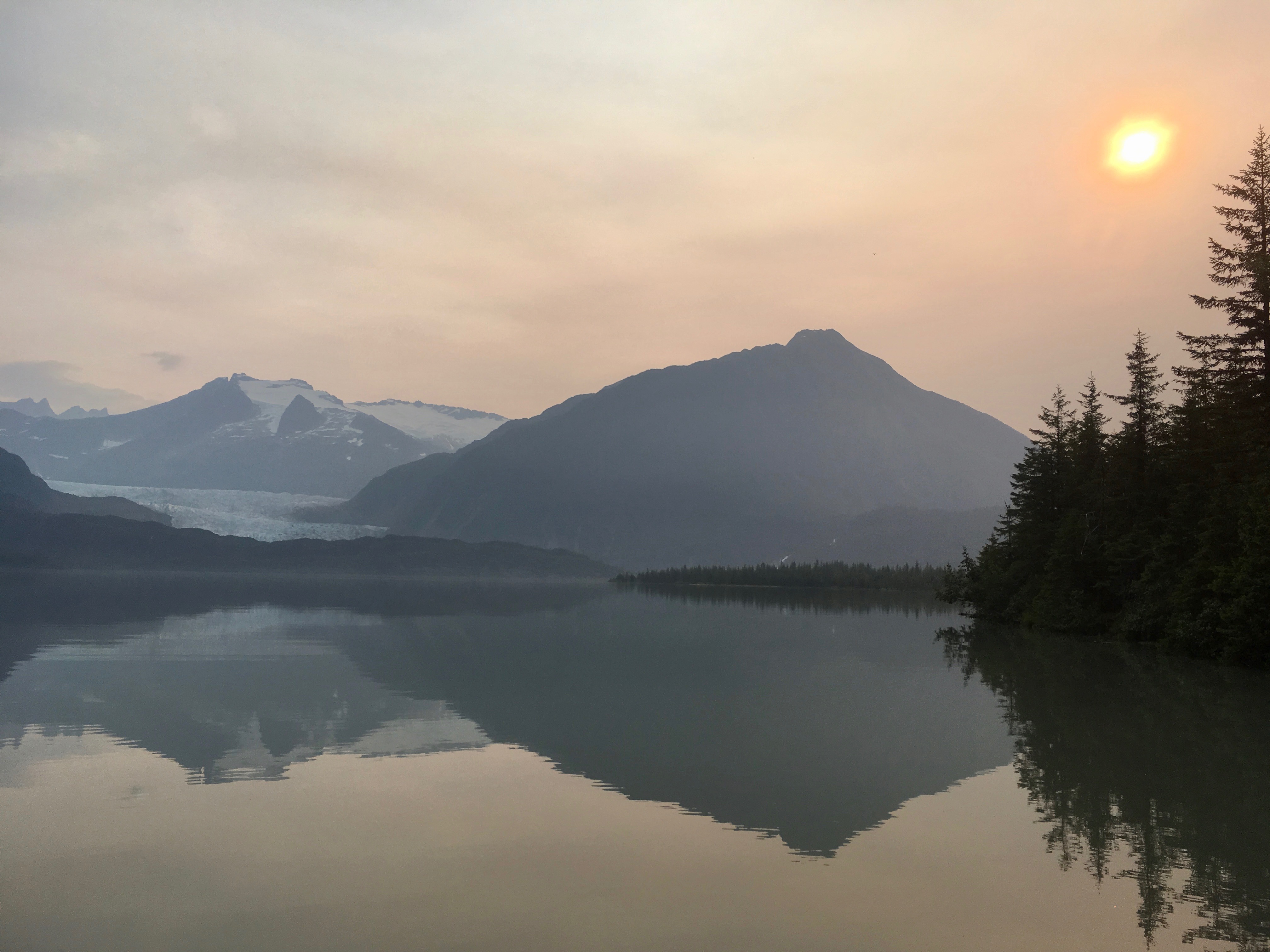 The sun is up but is blocked by the smoke. Light from it manages to power through the haze to sparkle on the surface of Gastineau Channel. We can hear eagles complaining from their beachside roosts. But tiny and feisty belted kingfishers are the only birds to show themselves.