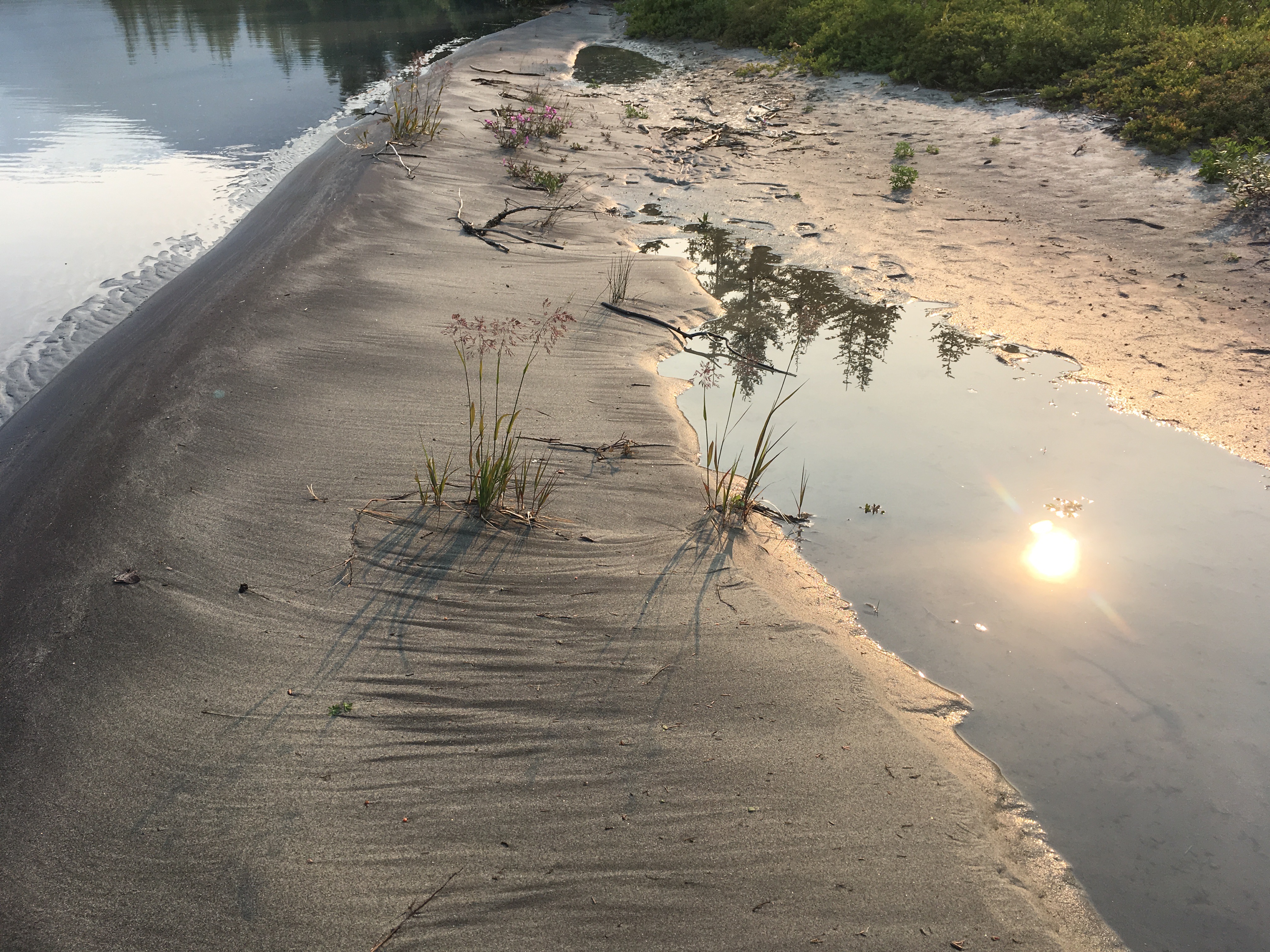 It’s another white sky day. Aki and I have just left the Treadwell Woods and dropped onto Sandy Beach. The beach’s “sand” is made up of crushed mine tailings mixed with the detritus abandoned when the Treadwell mines closed almost 100 years ago.
