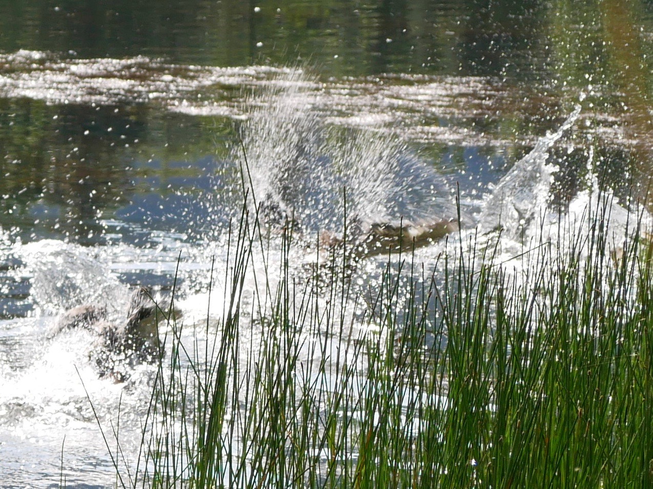 Aki and I might never have known about the mallards if I hadn’t stepped into a bog hole. I curse and the mallards crash out into the lake, splashing the water like a group of kids in a school pool.