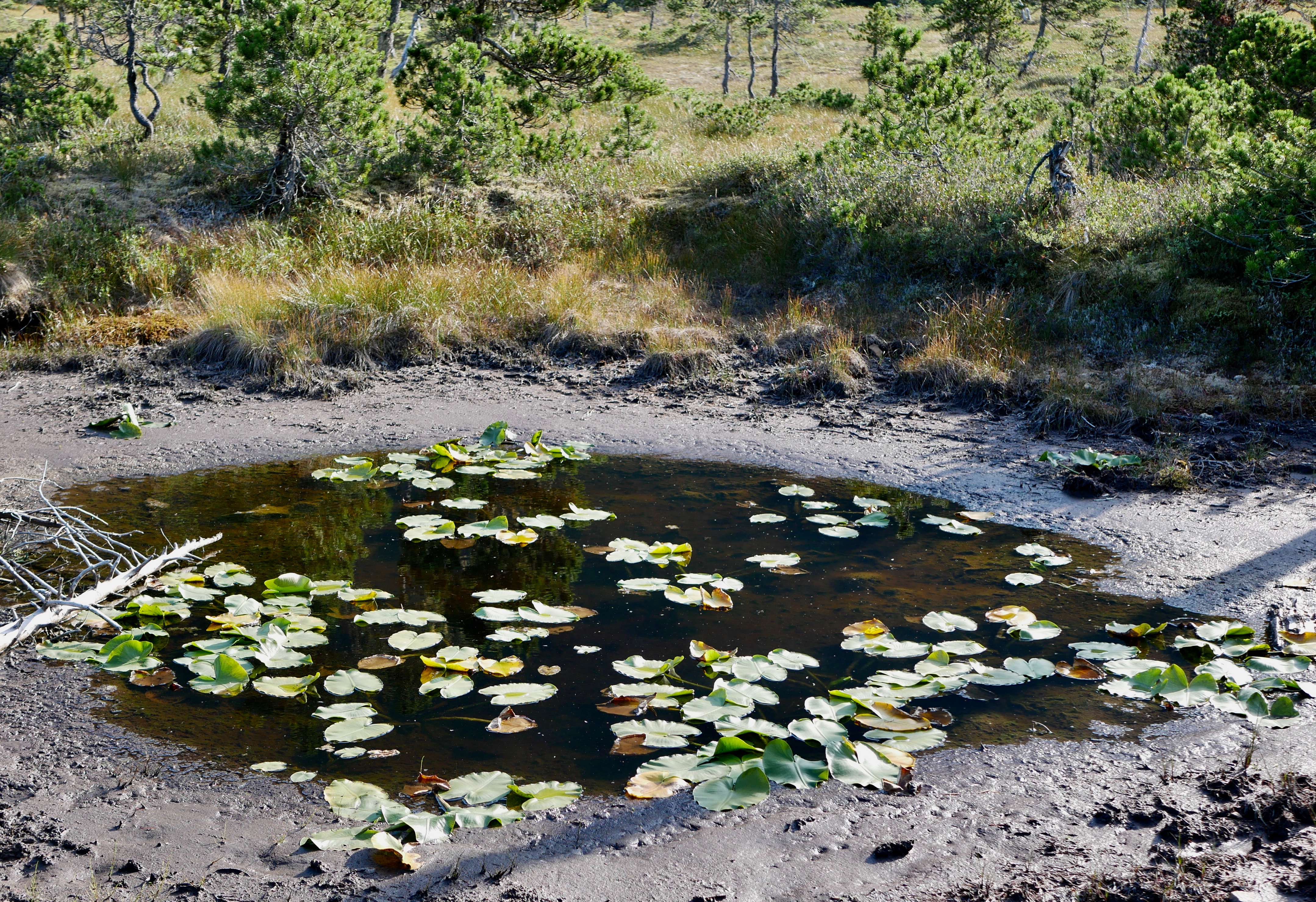 From a distance, the meadow seems as moist as ever. But it is easy to find evidence of drought. A rim of straw colored grass rings some of the meadow ponds, as if it were already autumn. The normally sweet blueberries taste bitter. Worse, at least one lily pad ponds now has a wide beach of mud. Last summer a foot of water covered the stuff.
