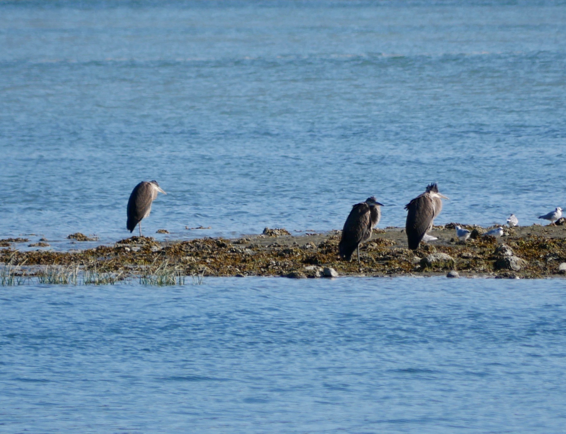 Three great blue herons have parked themselves on a gravel bar at the stream mouth. They aren’t fishing or even looking for fish to catch. They just squint into the sun, apparently waiting for Godot.