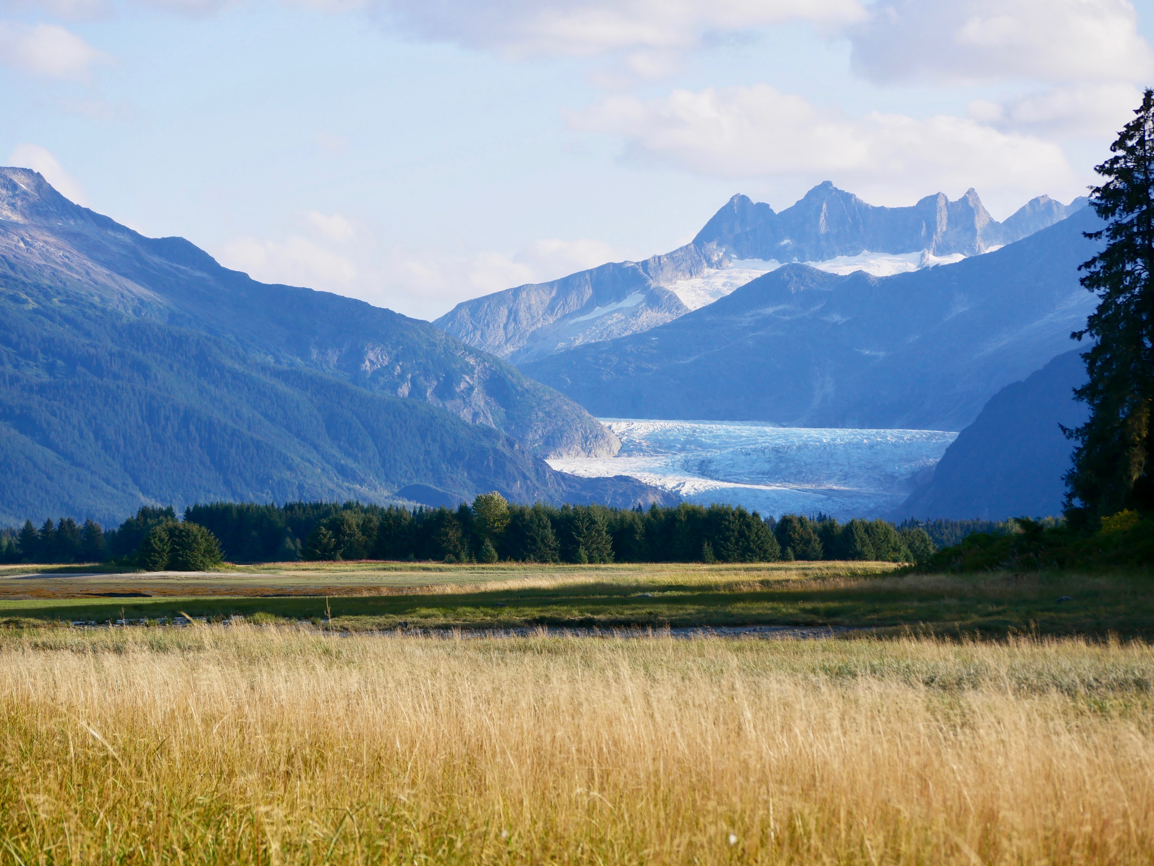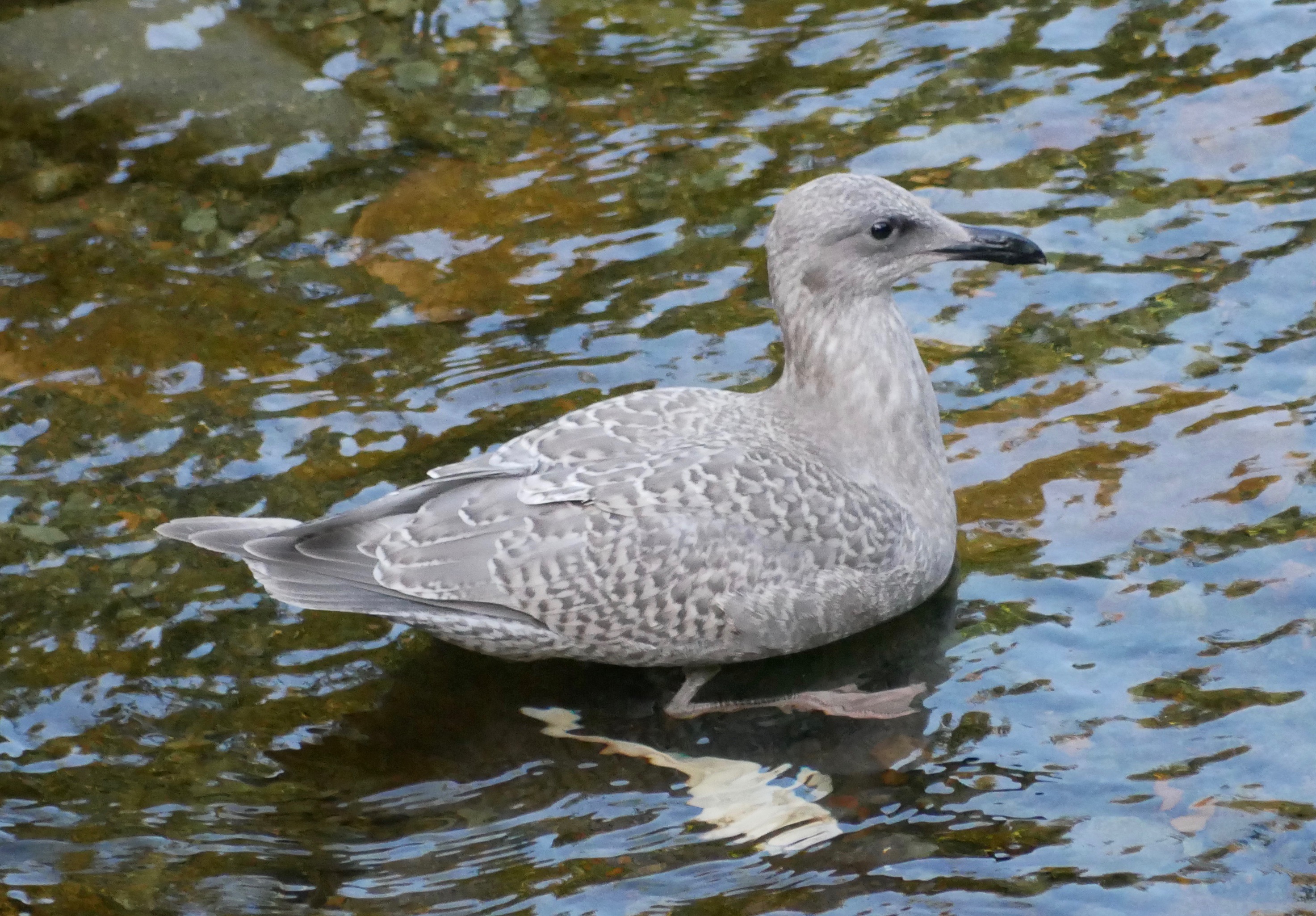 Pink salmon have replaced the chum salmon that tussled in the shallow water beneath the Fish Creek Bridge the last time Aki and I walked over it. Male pinks, with the distorted backs that earned them the nickname “humpies,” charge each other in the stream rapids. Unlike last time, when ravens and watched the salmons struggle, only a flock of no nonsense gulls takes in the show. There is one eagle roosting in a tree above the stream. Soon it will fly off.