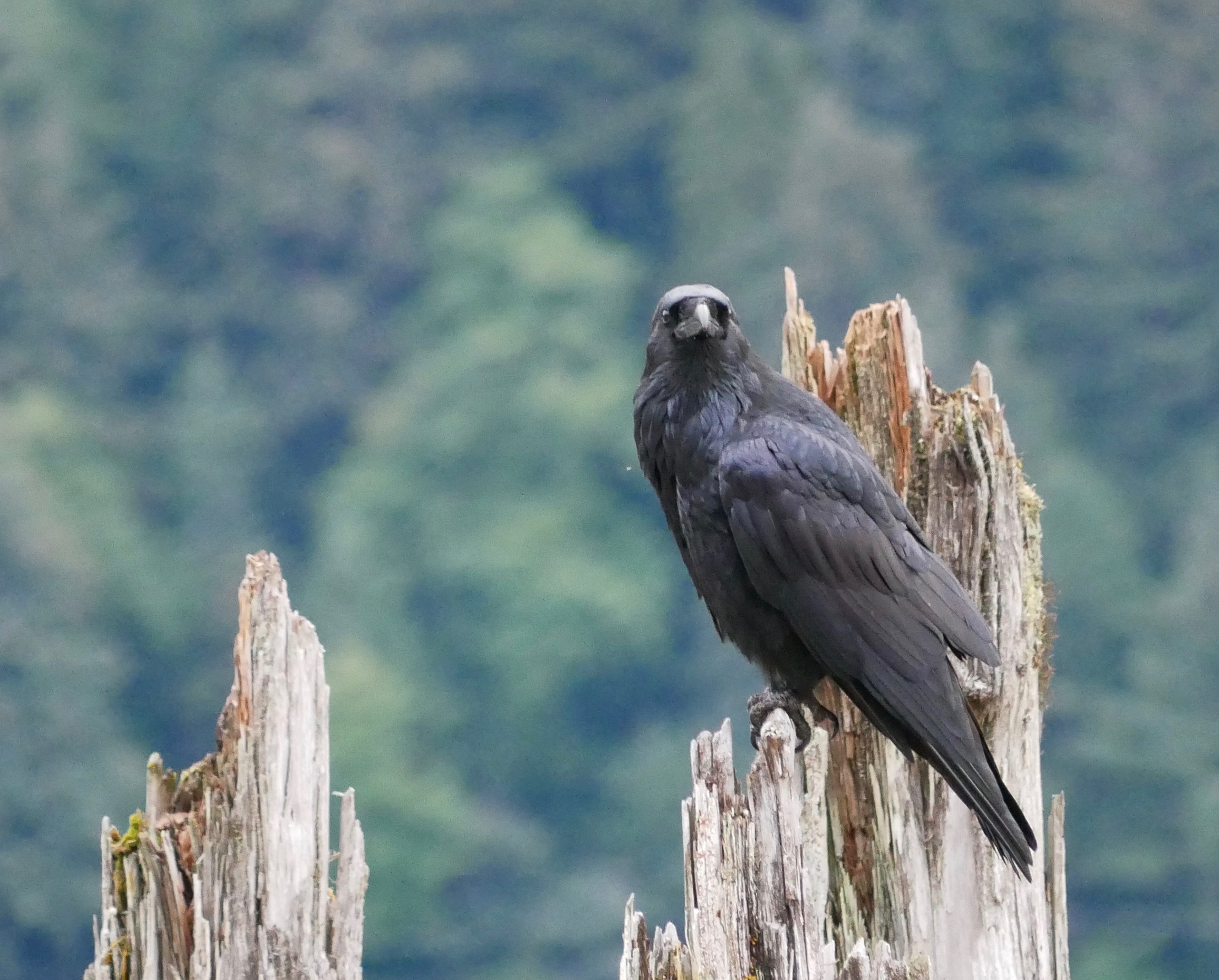 The eaglet gives us a fierce look and then turns until we can only see its back. Aki and I walk under the tree and then drop down through the woods and onto Sandy Beach. The two resident ravens watch us from atop splinted wharf pilings. Down the channel one of the eaglet’s parents balances on the roof ridge of the ventilation shaft. The other one must be hunting for junior.