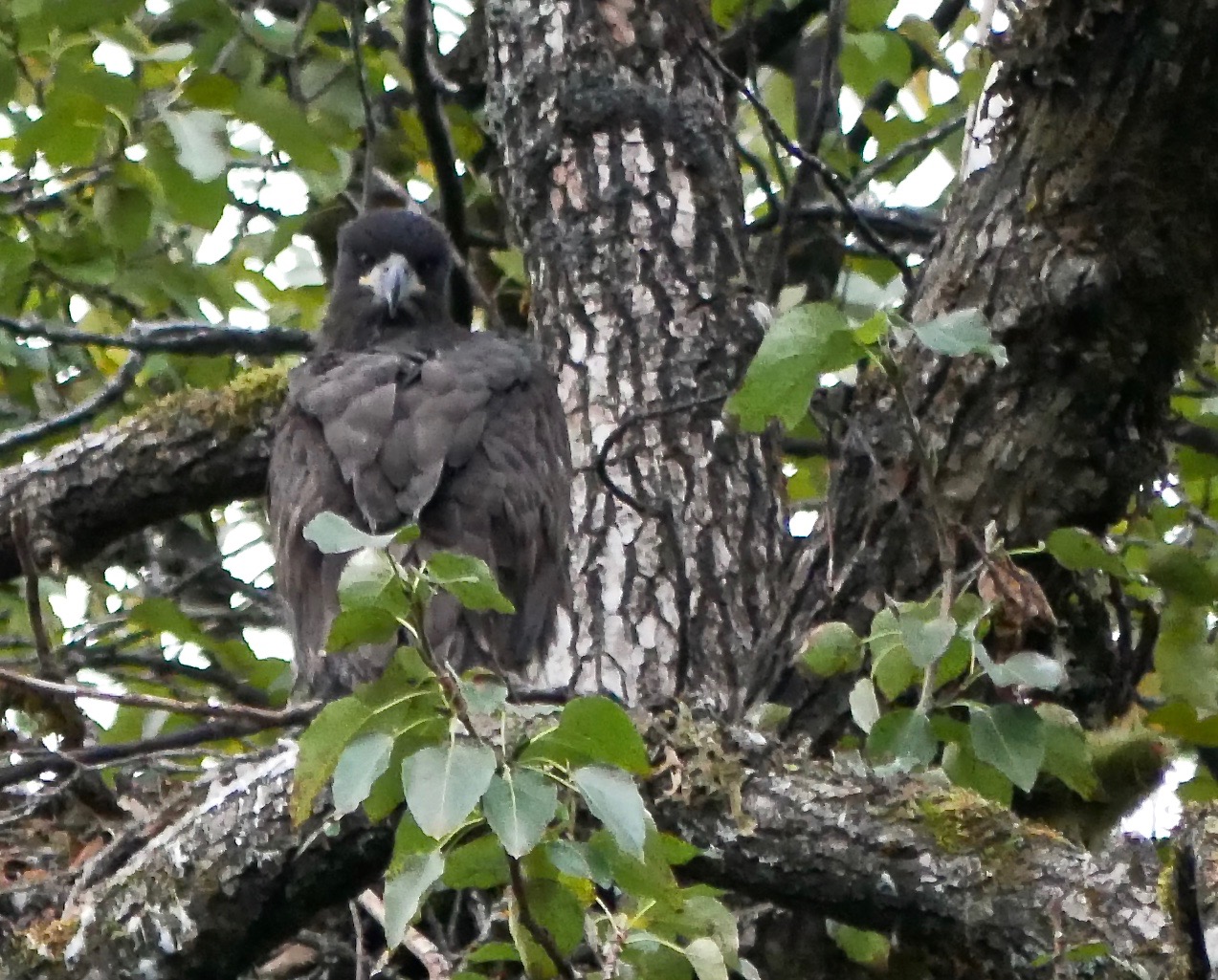 I lead the little poodle-mix toward the later sound. Soon we are at the base of a tall cottonwood tree. White eagle scat is spattered on the understory plants beneath the tree. One of those responsible for the mess sits alone in the nest of sticks its parents built in a crotch of cottonwood branches. It’s an eaglet that has grown out of its downy coat. Fuzzy black feathers cover its head. Soon it will fledge.