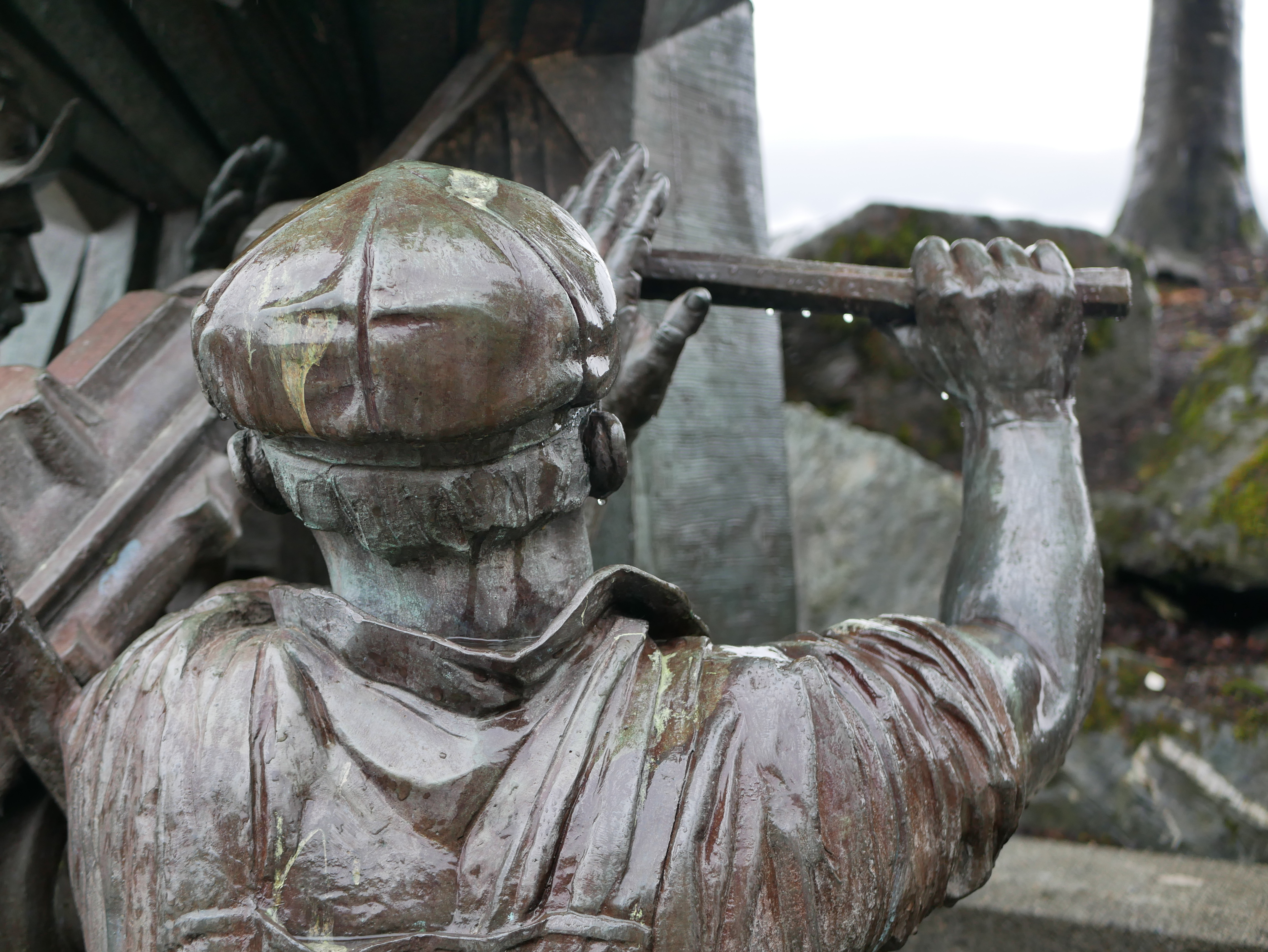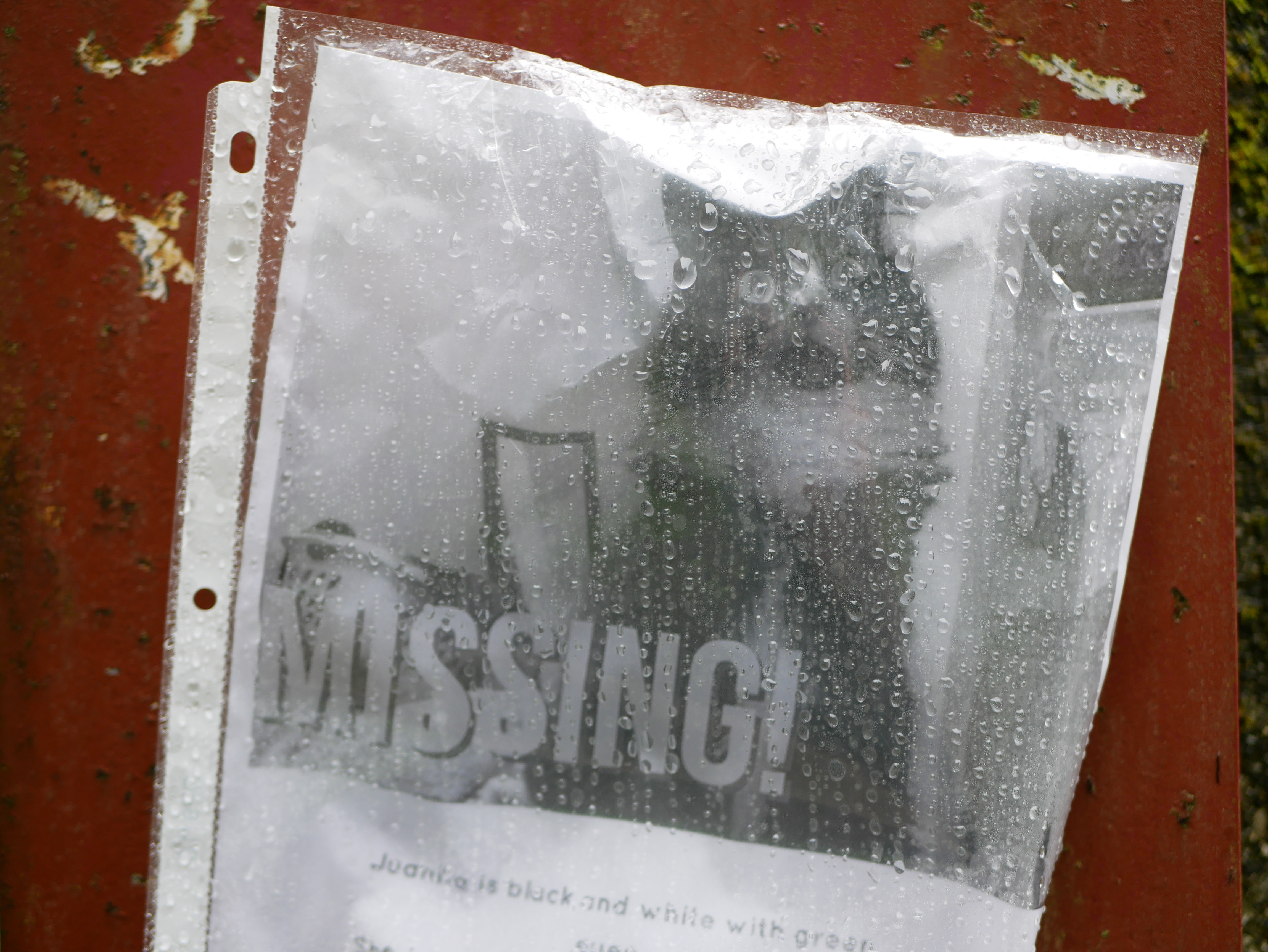 The little dog drags me down Gold Street, past the Episcopal Church, and up Gastineau Avenue. We pass sunflowers with yellow petals drooping with rain. Copies of a missing cat poster decorate light poles along Gastineau Avenue. I wonder whether one of the neighborhood eagles carried the poor feline away.