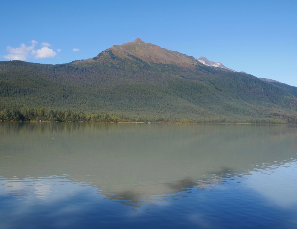 Displays of fall color could divert me from glacier gazing. But most of the lake foliage is still summer green. Only where the Mendenhall River escapes from the lake do I find a cottonwood in fall yellow. It stands out like an unnecessary candle on this warm, bright day.