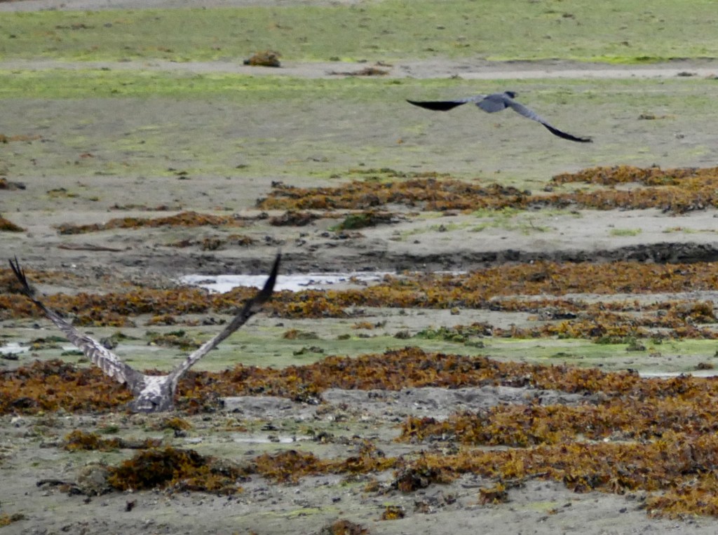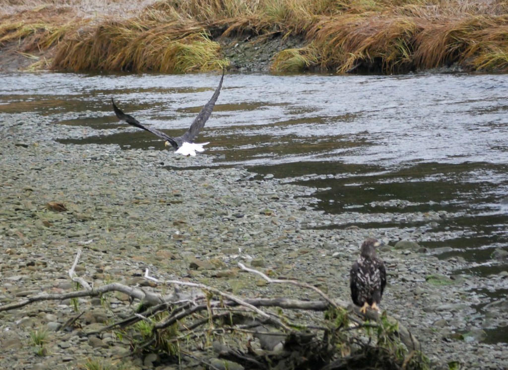 Hoping that the eagles have already had their fill of silver salmon, I follow Aki down the trail to the creek mouth. We do spot a run of the creek full of frisky salmon. But we can’t investigate without disturbing two eagles perched on a driftwood branch. The mottled birds look dull in this morning’s grey light.
