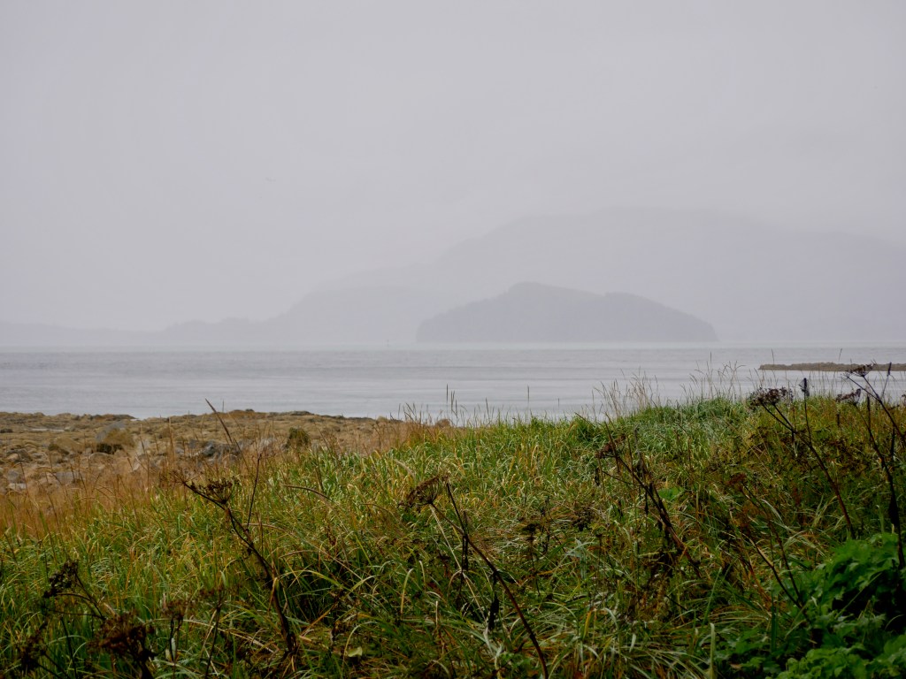 The forest seems to absorb the storm’s power, we walk down to the beach unbothered by wind but still soaked by the persistent rain. The water between the beach and Shaman Island is empty of birds. I assume that the resident ducks are still feeding in the open water sections of our rain forest archipelago. Then a man fires his shotgun twice, flushing an eagle and several gulls into the air. The eagle joins two other eagles circling the treetops of Shaman Island. Aki whines and crouches close to the soaked ground. We return to the woods, hoping that the gunner is blown off the beach by the storm.