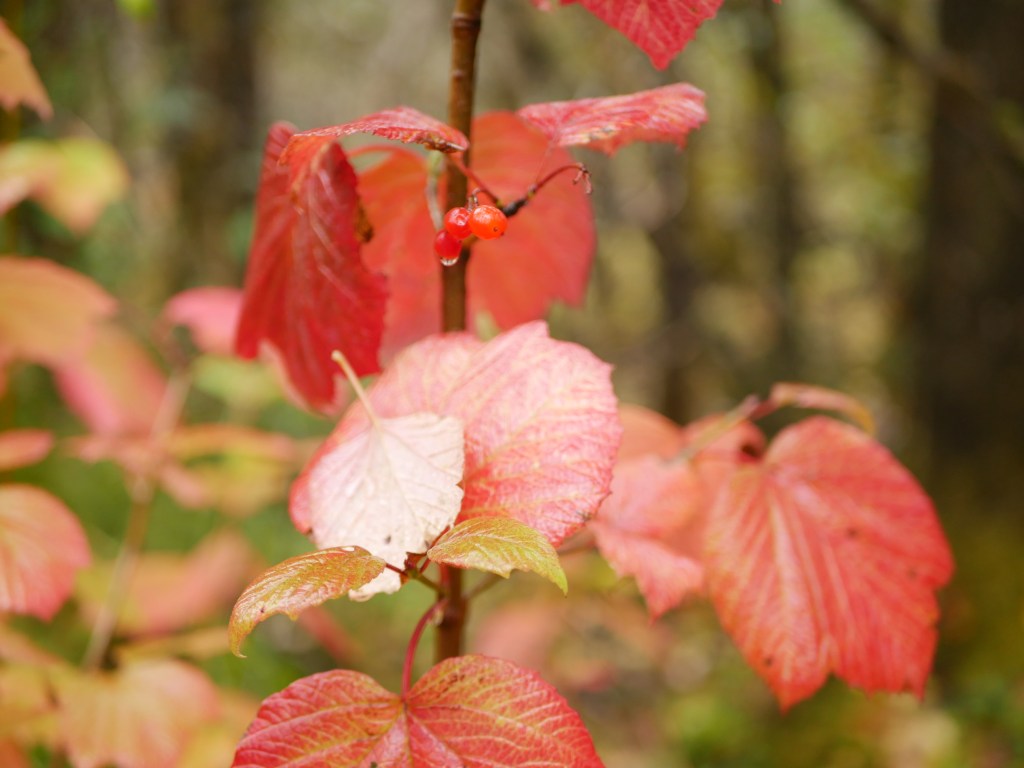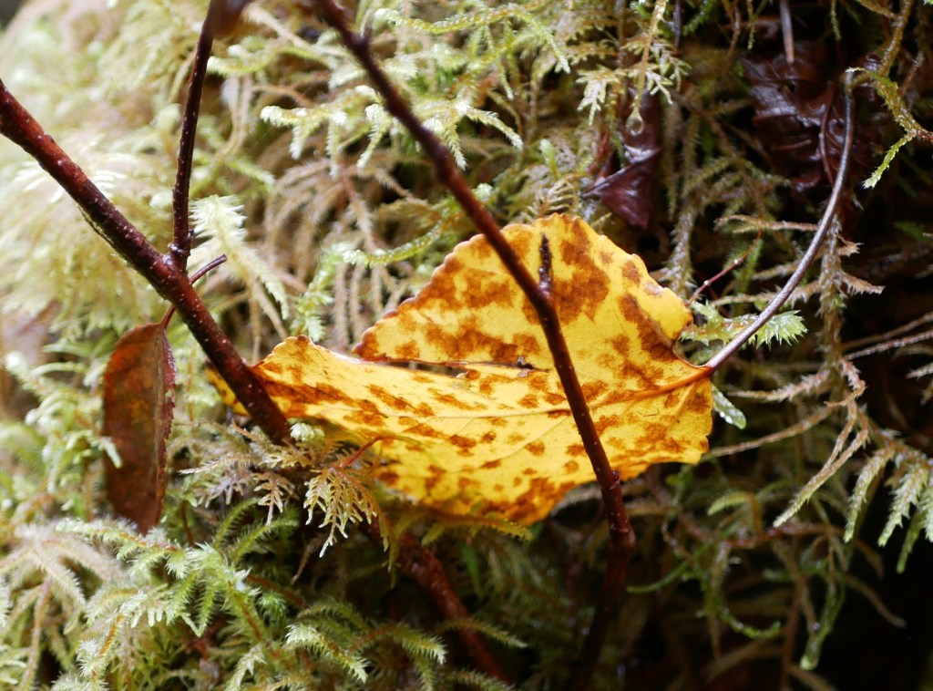 There is beauty this morning in the Troll Woods. I can see it after wiping rain from my glasses. It comes from the rain that coats the reddening leaves with shimmering shellac and forms crystal globes of light on the bottom of high bush cranberries. Aki, a more than willing participant in this adventure, shivers as I study the leopard pattern of a cottonwood leaf that has lodged itself in a tangle of tree moss. She is fine as long as we keep moving, so I try not to stop often.