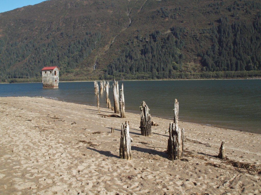 Sunshine powered through the forest canopy, raising the candlepower of yellowing devil’s club leaves beyond what my old DSLR could handle. Aki must has been squinting her eyes. We moved to an overlook where through a double chain link fence we watched a stream plunge several hundred feet into the flooded glory hole. Anywhere but here, where every mountain hosts at least one waterfall, this one would be mentioned in tourist material. Only locals can find this waterfall, and only those willing to climb the fence can see it’s entire length.