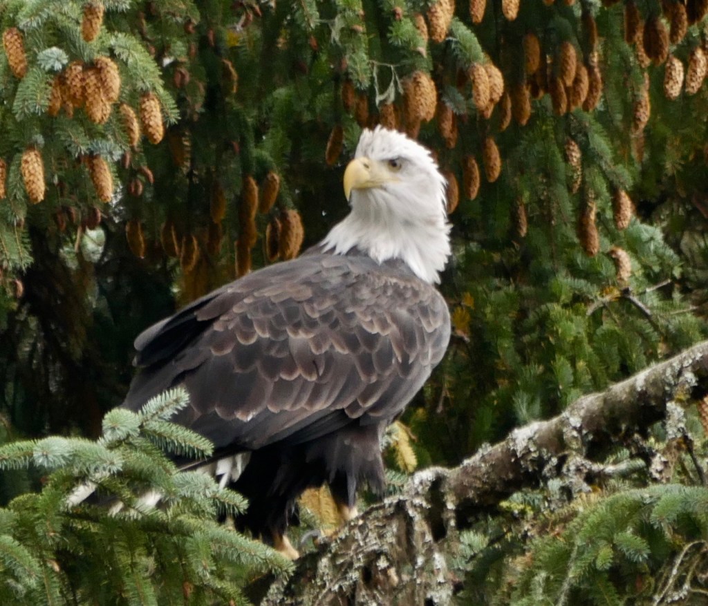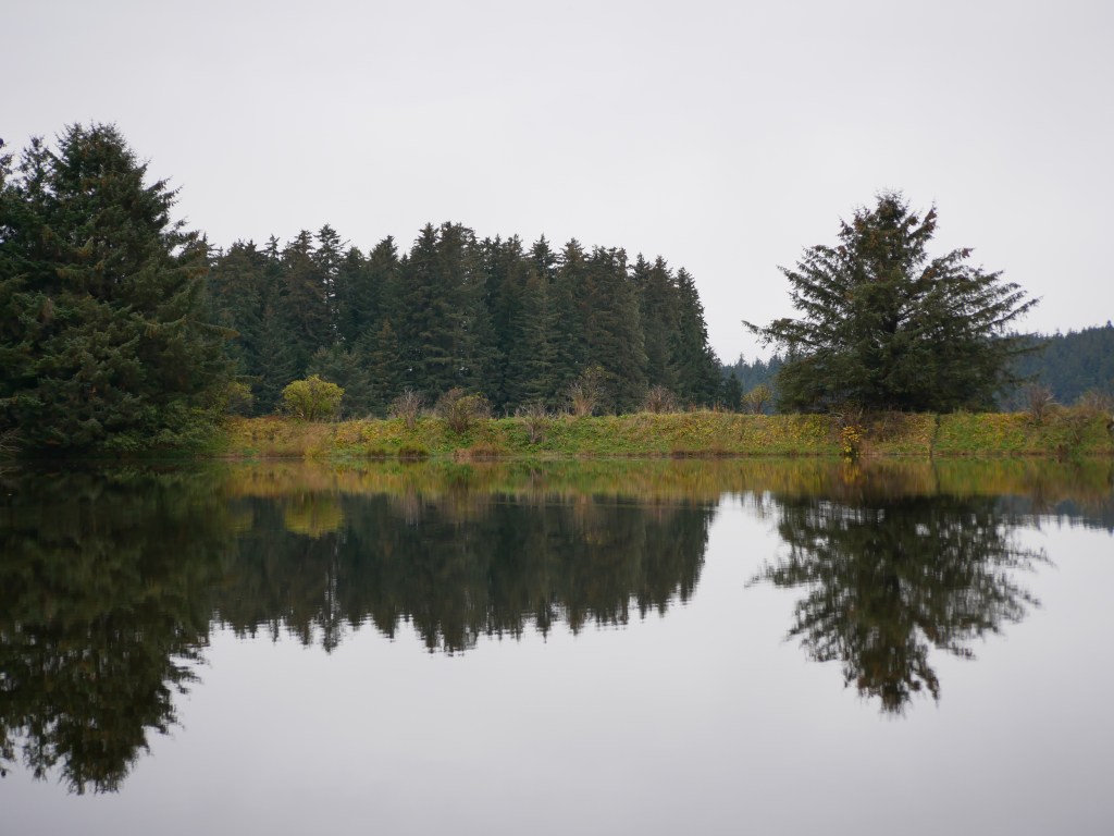 No salmon swirl the surface of Fish Creek Pond or leap from it into the air. No scavengers bicker over salmon scraps on the pond beach. The time for that passed when last week’s high water swept the remaining pink salmon back into the sea. Last week three eagles, the little dog and I watched a dozen mergansers plop onto the lake. This morning only one of the redheaded duck works the pond. It looks to be a day of ones.