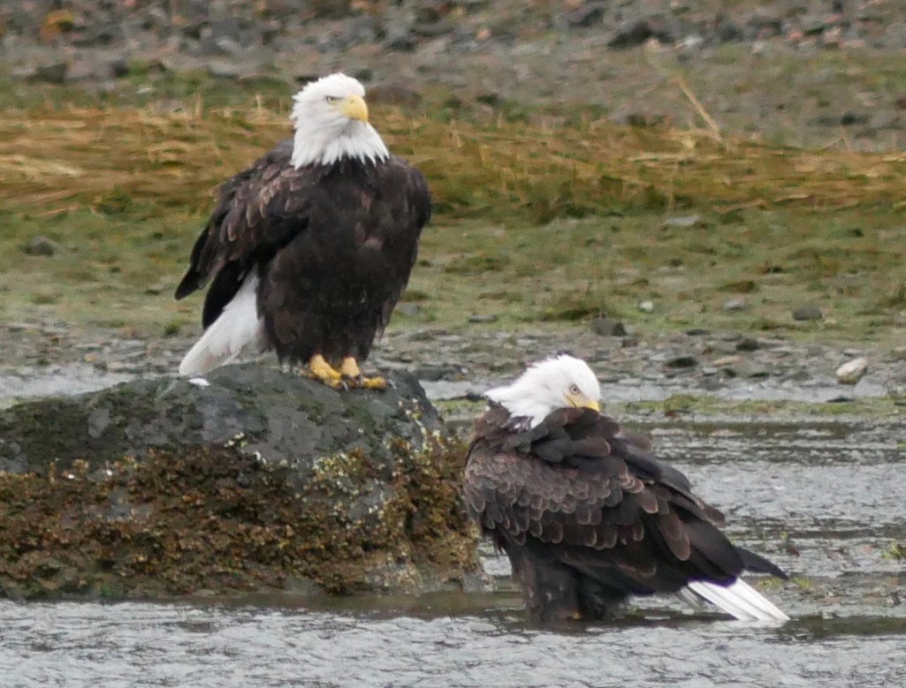We inadvertently flush a water dipper. It flies low and lands across the stream. Something in the stream must be keeping it and the eagles here. For the dipper it could be insects or small fish. The eagles prefer salmon. It doesn’t matter if they are dead or alive. Maybe these eagles filled up on salmon carcasses that wash up on the delta. Or maybe they have been hammering invisible salmon.