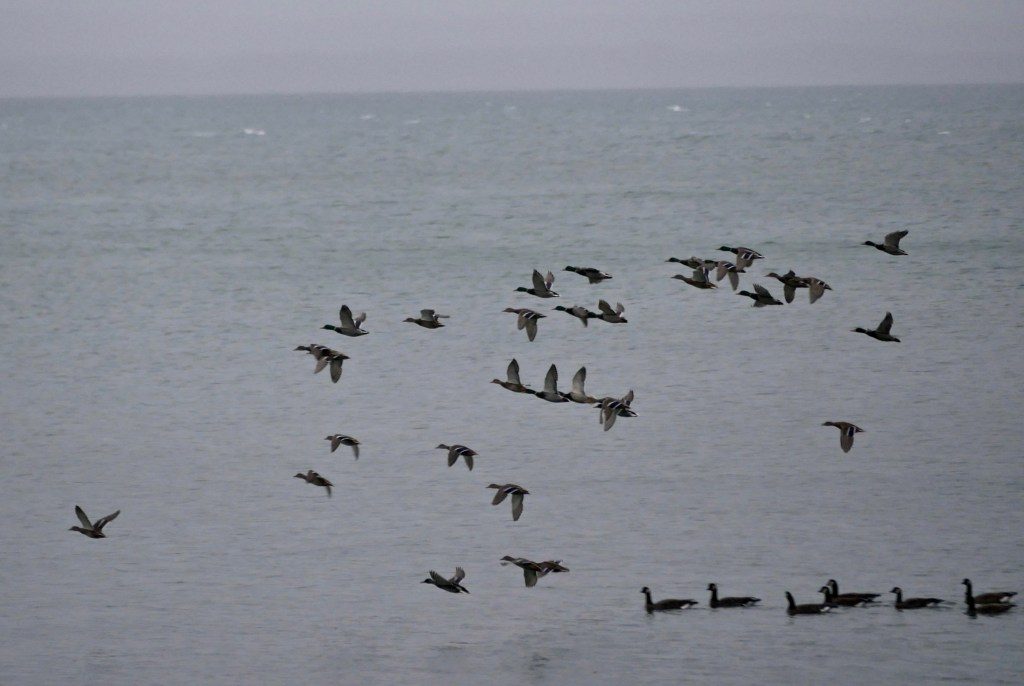 Only gulls stir the water when we reach the beach, which is in the wind shadow of the forest. Six Canada geese and a hundred mallard ducks huddle near the beach. Even though the little dog are100 meters away, the geese leave the protection of the beach and move in formation out onto the little bay. They don’t change course when an eagle flies over their heads. The eagle panics the mallards into the air. All but three fly across the bay. The outliers plop down on the water near the geese. What have these ducks seen to cause them to seek the company of another species when eagles threaten?