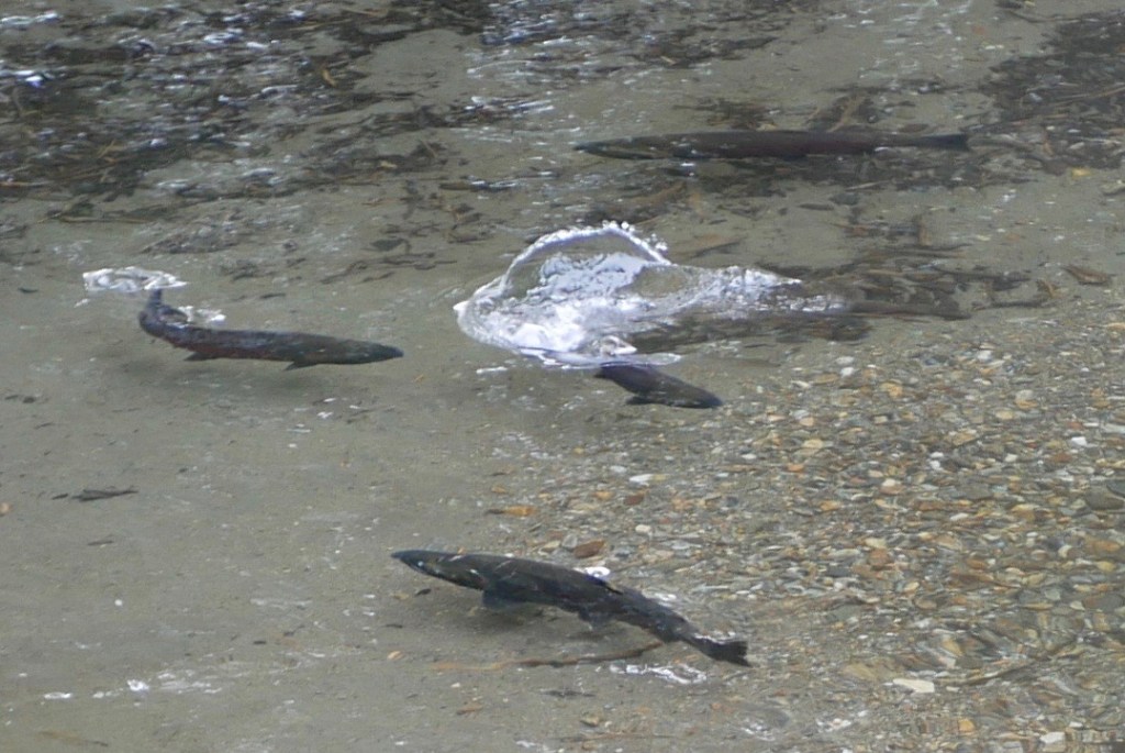 Three ravens watch as we enter a section of second growth woods drained by a salmon stream. One glides just over my head and lands on a spruce bough. The raven is now watching a dozen silver salmon, sides long faded to the color of ash, fight for spawning rights in the stream. Two men wearing the cast-off winter gear of the homeless look to be trying to grab the fish with their bare hands. Nailed to a tree just above their heads is a “No Sport Fishing” sign. The little dog and I walk on almost secure in the knowledge that the men are no match for the frisky fish.