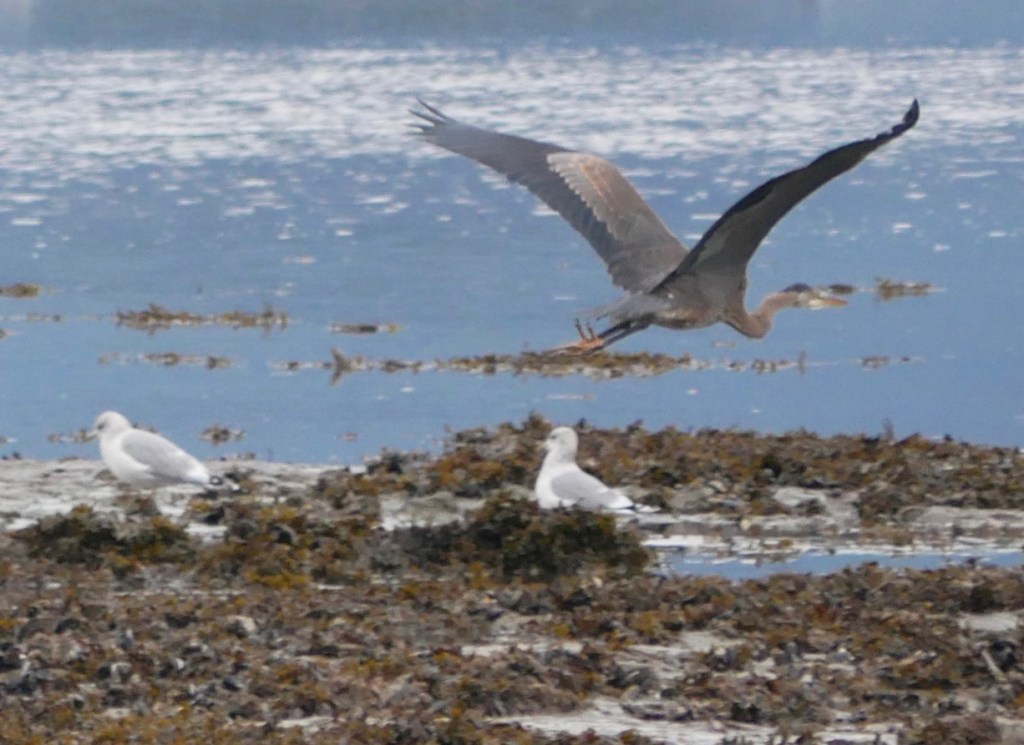 We have just turned our back on a great blue heron, leaving it standing tall among gulls on a gravel bar. The heron was looking toward the glacier, not the gulls or Aki, when we slipped around a rocky headland.