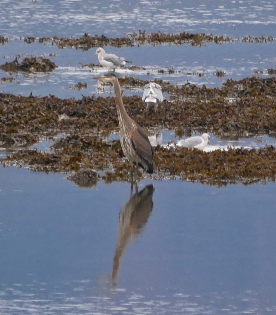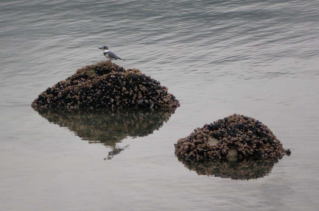 Looking toward the sound, we spot a belted kingfisher shooting out of the water. It lands on an offshore rock just as another plunk sounds. This one is made by the first bird’s mate. The first guy flits onto another rock, drawing attention away from the other bird. It stands in profile with its huge beak pointing down the beach. Each time we move a few meters away from the second bird, the first one glides down the beach. When we are thirty meters from the second bird, the first guy circles over the water and reunites with its mate.