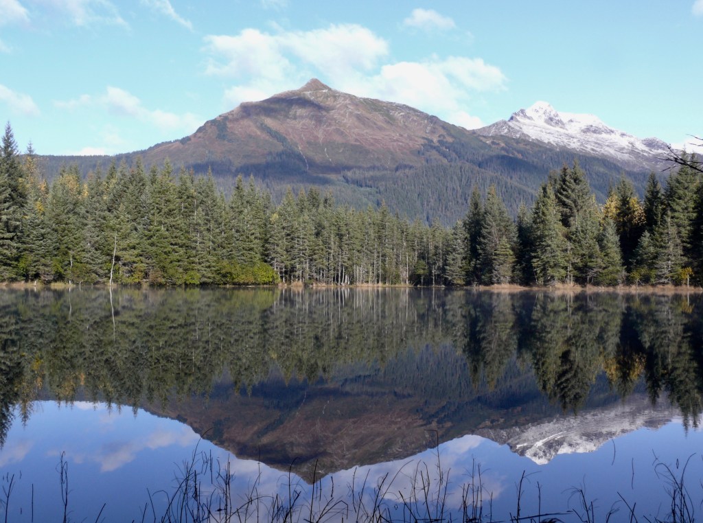 Aki was back in the car before the eagle landed. We are both soaked with rain that just stopped pounding the Sheep Creek Delta. The clouds now drift up against the flanks of Sheep Mountain to be shredded by tall spruce. I brought the dog here so I could search for heron. We found none. Aki tried to keep me from crossing exposed sections of the beach. She prefers to sniff along the grassy dune that separates the beach from the old ore house. There she can hide from eagles.