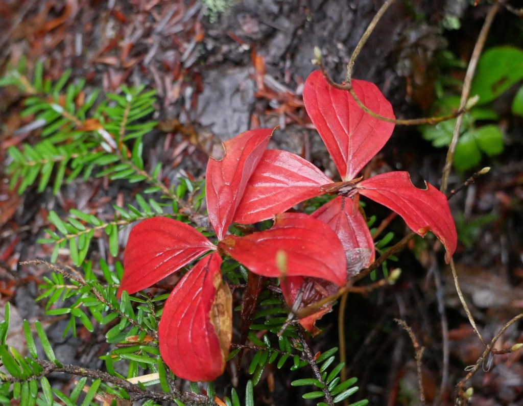 The rain forest is darker than the last time Aki and I visited. Then leaves still held their fall color. This morning it’s all bare branches and fallen leaves quickly being reduced to mush. Only the bottom hugging sorel retain color. On the drive to the trailhead I spotted two lines of sand hill cranes heading toward the forest. Now, mixed in with the noise of a passing prop plane, I can just make out their ratching calls.