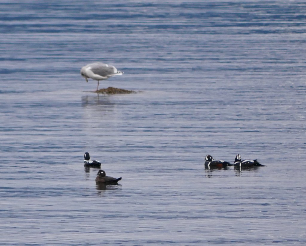 Weeks of heavy rain have swollen the beaver pond and flooded parts of the trail. The pond is empty of cranes or other birds. My eyes are drawn to the islands of golden-brown reflected in the pond water. Aki breaks ahead of me to circle around a submerged portion of the trail. I follow her to a beach that borders a small cove. Gulls and mallard ducks are the only things that disturb the flat-calm water.