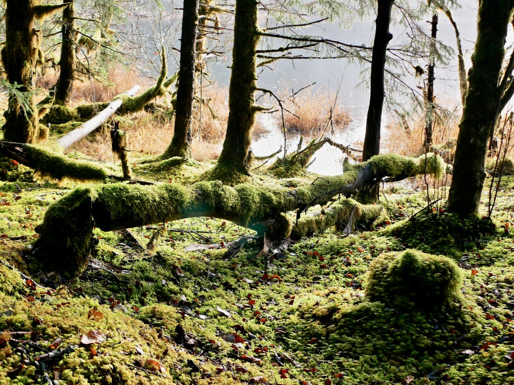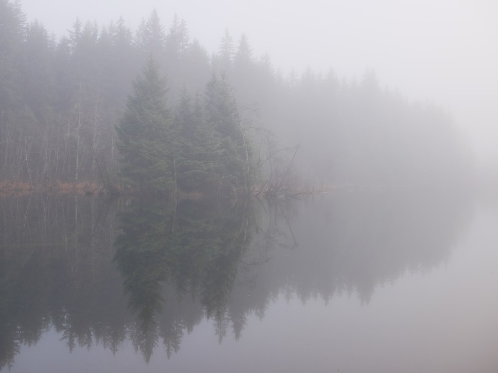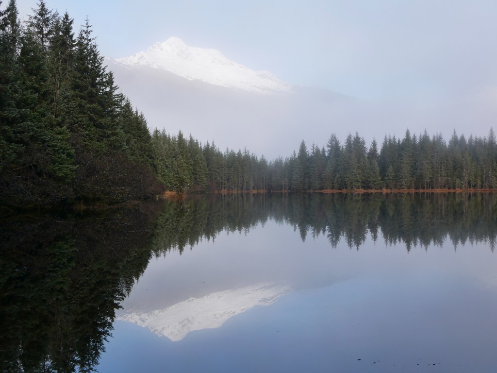 Occluding fog reduced our view shed to fifty meters when we first arrived at the trailhead. Now the sun is burning through. The snowy peak of Mt. Stroller White suddenly appears. Dark, duck-like forms cruise in and out of the fog bank still floating over Moose Lake.