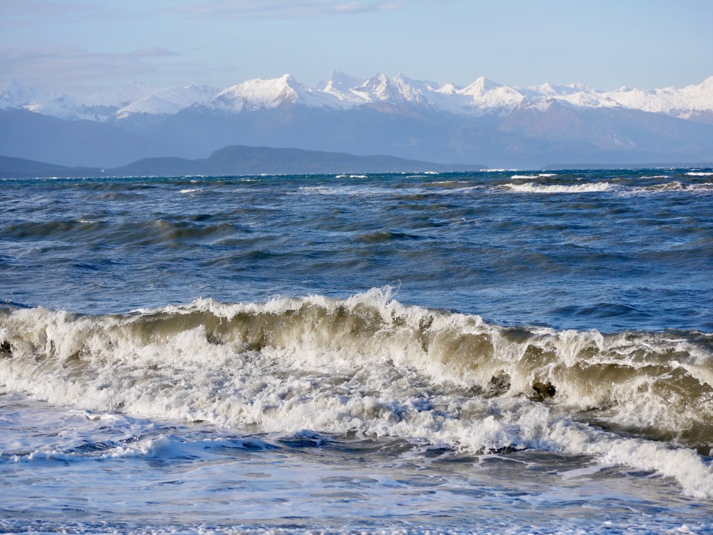 The little dog and I are not used to dramatic surf. Up close, it sounds like a hundred Nugget Falls after a week of heavy rain. We turn our backs to it and climb a sand berm then drop onto another tidal meadow. The berm blocks the wind and dampens the sound. As we make our way back to the car I try to catalogue all the sounds that moving water makes—the plop of a water drop, hum of water moving through a culvert; water gurgling, shushing, dripping. There is enough diversity for a D.J. with time and a good ear to make a symphonic mix-tape.