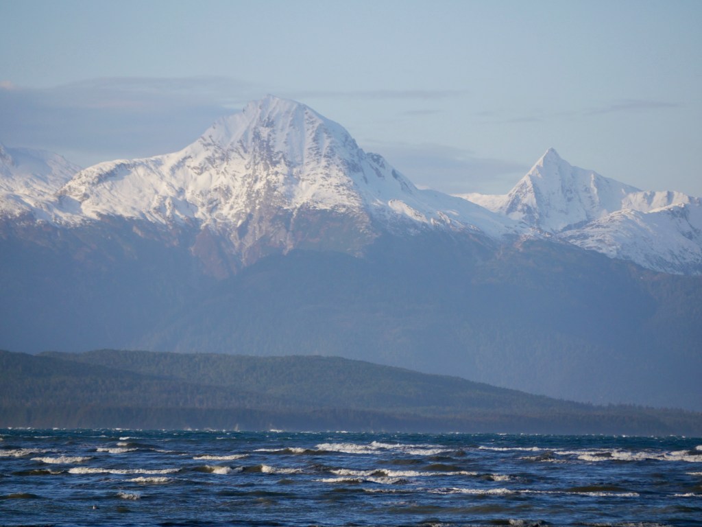 We can hear the ocean long before we see it. Strong westerly winds have raised a surf that pounds onto Eagle Beach. Some of the waves move into the river to crash against a steep section of riverbank. Past wave erosion collapsed the prior bank, forcing crews to relocate the trail two times. Just down river living spruce trees, their roots undercut by wave action, have tumbled into the river.