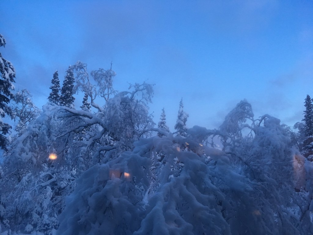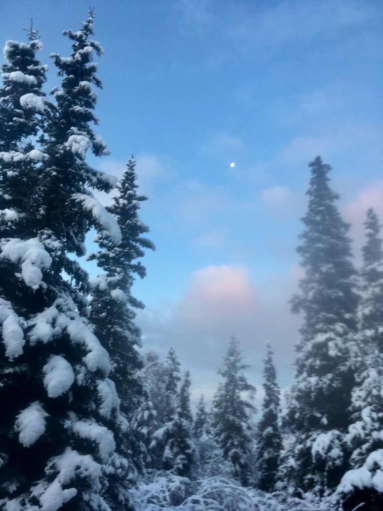 I am in Anchorage, on the hillside above town, watching the first snow of the year whiten the ground. Aki is in a Juneau, in the rain. I wish I were on skis or even wearing boots, getting ready to explore one of the hillside trails. But I’m inside, drinking coffee and listening to the words of fellow writers. As the snow falls, the ideas build one upon another.