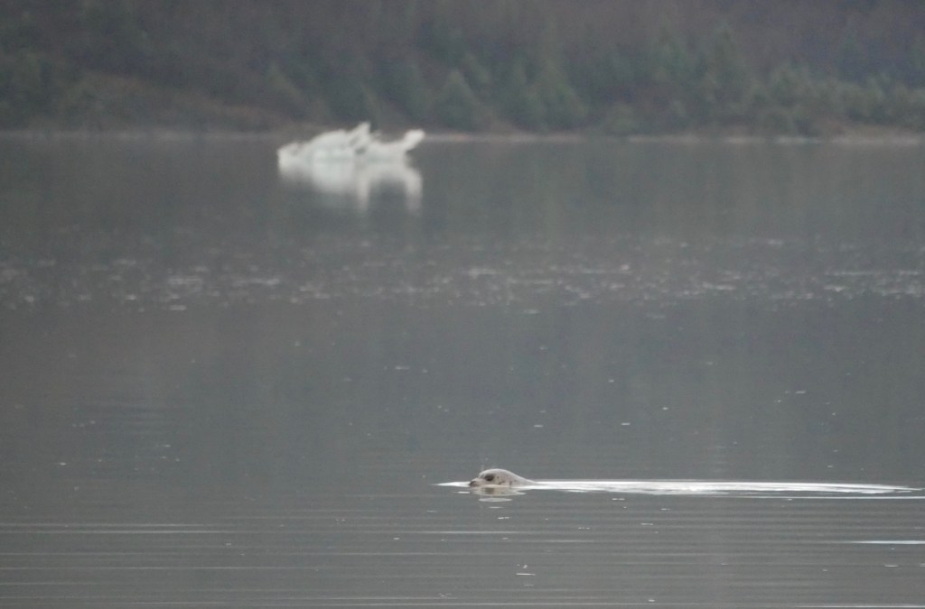 Something hidden swirls the lake’s surface, rippling the glacier’s reflection. Ten meters off shore the head of a harbor seal breaks water. After snatching a quick look at us it is submerges. When the seal next comes up for a breath, it will be fifty meters away. There must still be some salmon working their way across the lake to their spawning stream.