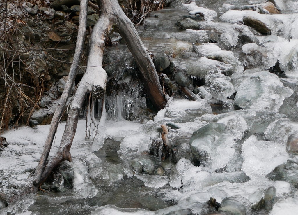 We are hiking up the Perseverance Trail, which was dusted with snow last night. Gold Creek still runs free but ice covers the creek’s tributaries. Not one leaf clings the trailside trees. It feels like a land waiting for winter.