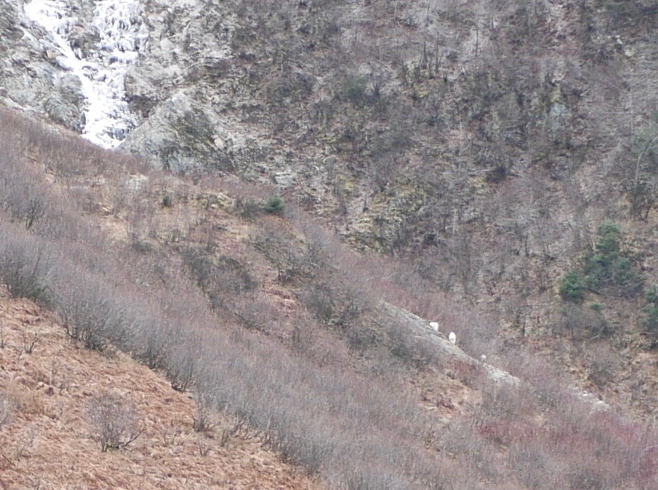 As three mountain goats climb the south flank of Mt. Juneau, I bend down to bag Aki’s scat. I want to ignore the steaming pile of poop so I can watch the goats approach a frozen waterfall. But the poop scoop needs to be done.