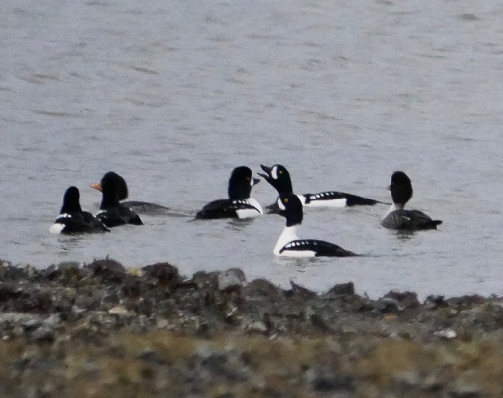 After the little dog joined me on the dune, we moved toward the channel for a better view of the ducks. The golden eyes were keeping close to the shore even as we approached them. Usually they would edge out into the channel, like shop lifters moving slowly out a store’s door to avoid looking suspicious. This morning, when they tried to edge out a little, they quickly returned and to the shallows. That’s when the seal head appeared. It wasn’t the first time that we had been used without our knowledge to herd ducks in a seal’s direction.