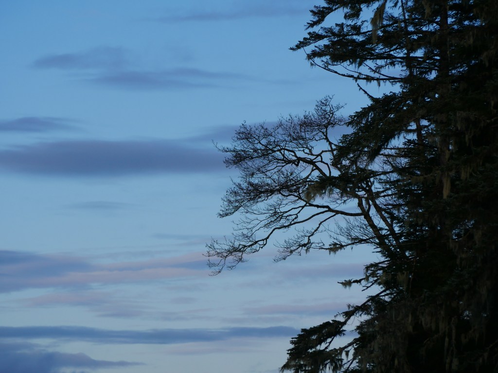 We make it to the beach before the sun fades. The clouds have almost blocked it off. What sun light escapes marks the close-in clouds and hillsides with sunset purples and pinks. But it still manages to make the snow-covered flanks of the Chilkats painfully white.